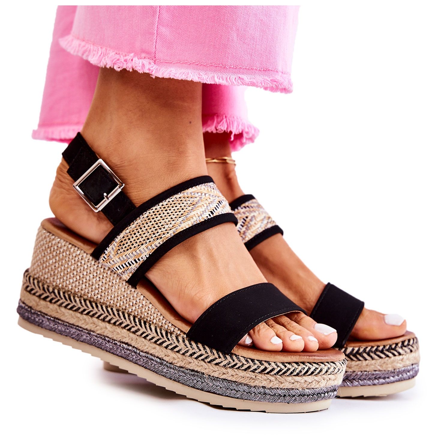 Die Sandalen werden mit einer Schnalle am Knöchel befestigt, was eine perfekte Passform am Fuß ermöglicht. Der mit drei geflochtenen Riemen in verschiedenen Farben verzierte Keilabsatz verleiht den Sandalen einen einzigartigen Charakter. Die rutschfeste Sohle sorgt für Stabilität, die gerade an warmen Tagen, wenn wir uns im Freien aufhalten, notwendig ist.