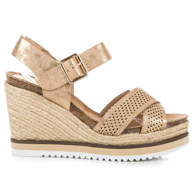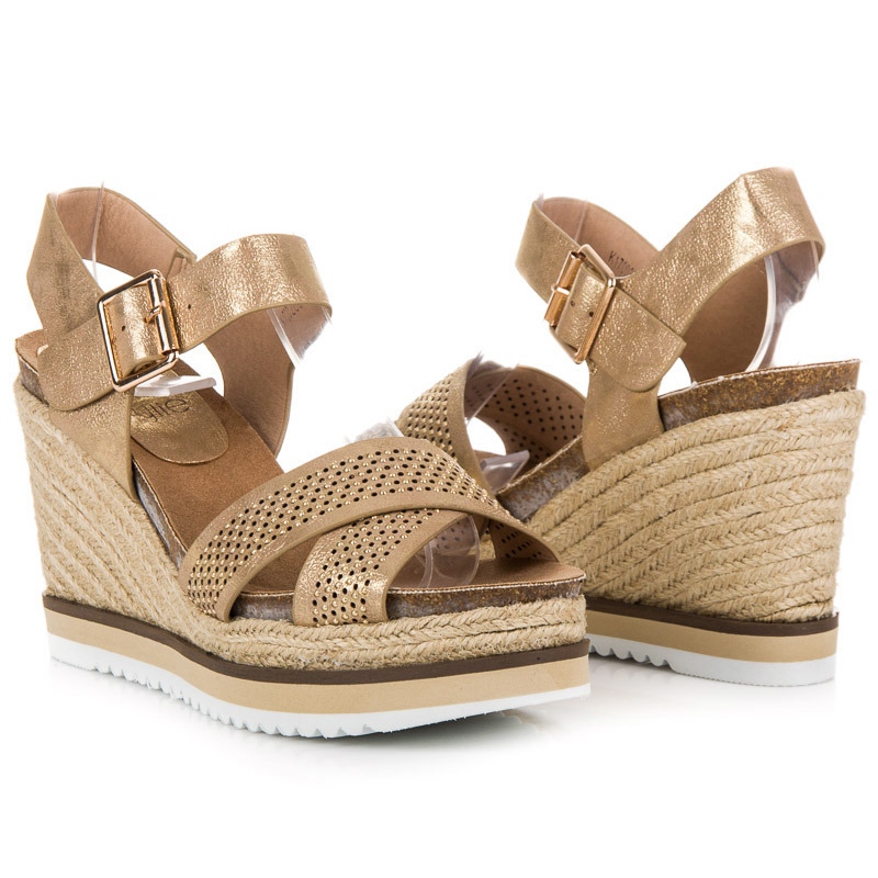 Kylie Wedge-Sandalen zeichnen sich durch ein klassisches Espadrille-Design aus, das die Weiblichkeit betont und dank eines 11 cm hohen Absatzes die Beine verlängert. Sie bestehen aus hochwertigem ökologischem Leder und sorgen für Langlebigkeit und Tragekomfort. Das Fehlen einer Nase und der Schnallenverschluss ermöglichen ein einfaches und schnelles Anlegen.