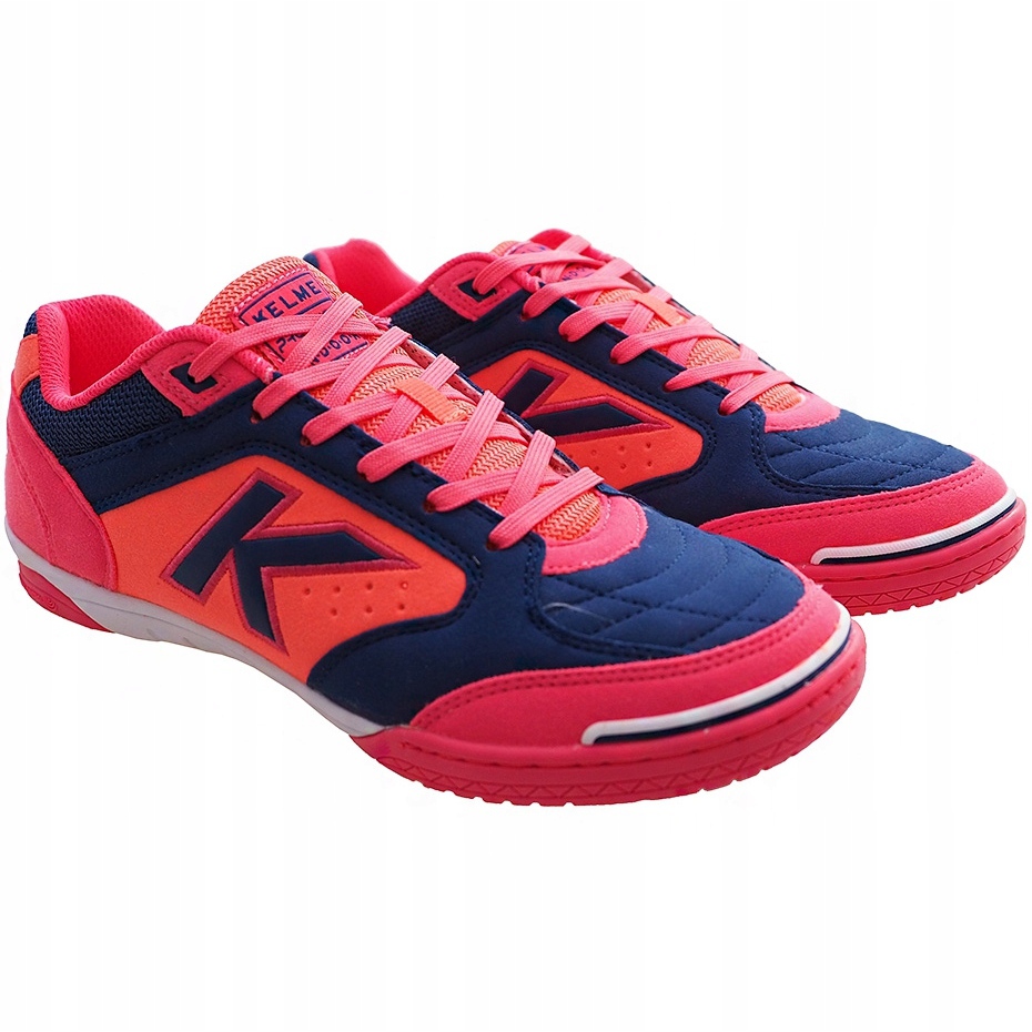 Kelme Precision Indoor 55211 9816 Innenschuhe - farbenfrohe, stilvolle und funktionale Schuhe für das Spielen in der Halle und in den sozialen Spielen. Das Modell in intensiven Tönen aus rosa, dunkelblau und orange fängt das Auge und bietet gleichzeitig Komfort und Kontrolle über den Ball bei dynamischen Aktionen.