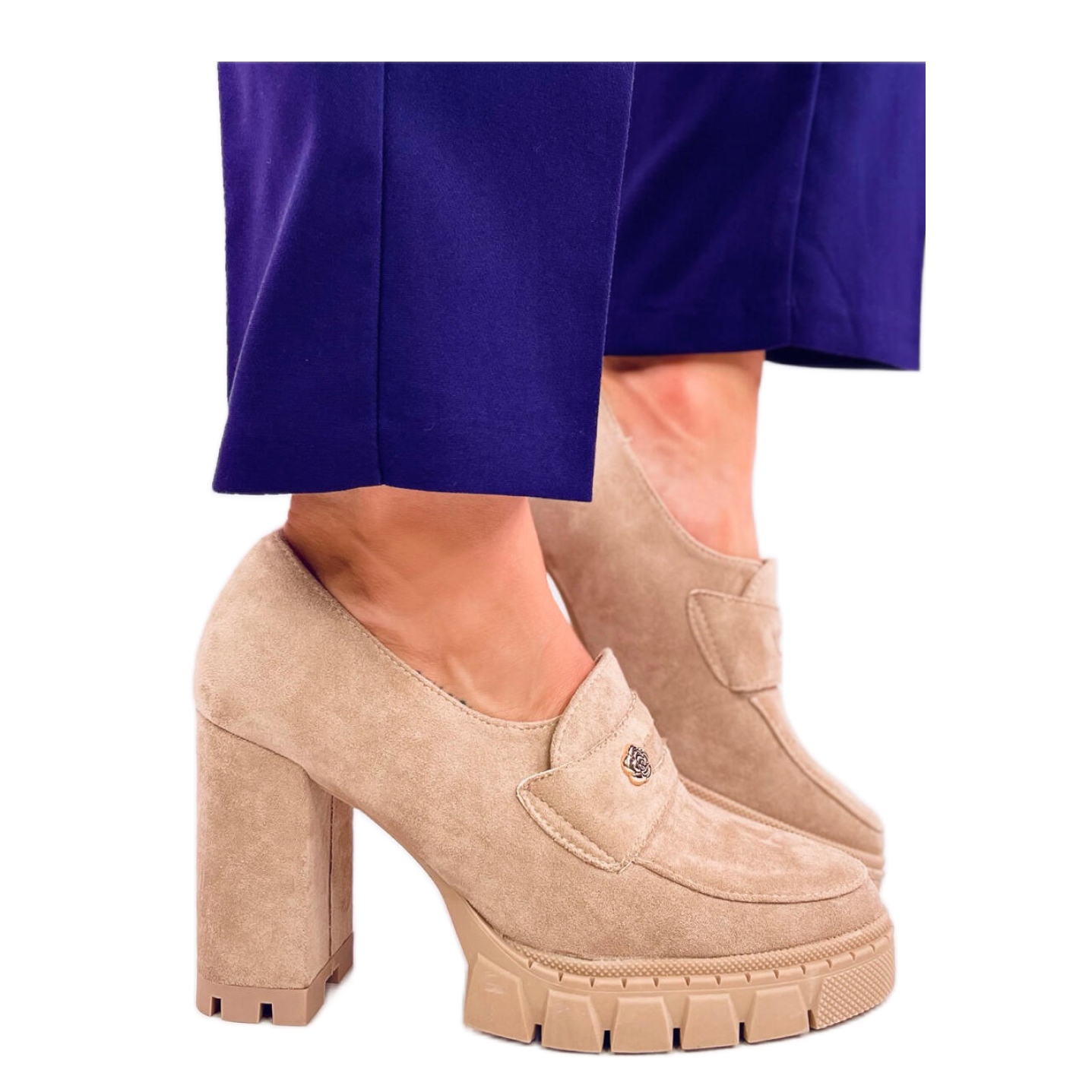Moccasins zeichnen sich durch eine Fersenhöhe von 10 cm und eine 2 cm hohe Plattform aus, was ihnen einen attraktiven, visuell verlängerten Effekt verleiht. Die subtile Blume, die das Obermaterial dekoriert, verleiht den Schuhen einen einzigartigen Charme und zieht Looks an. Sie bestehen aus ökologischem Wildleder und sind nicht nur stilvoll, sondern auch umweltfreundlich.