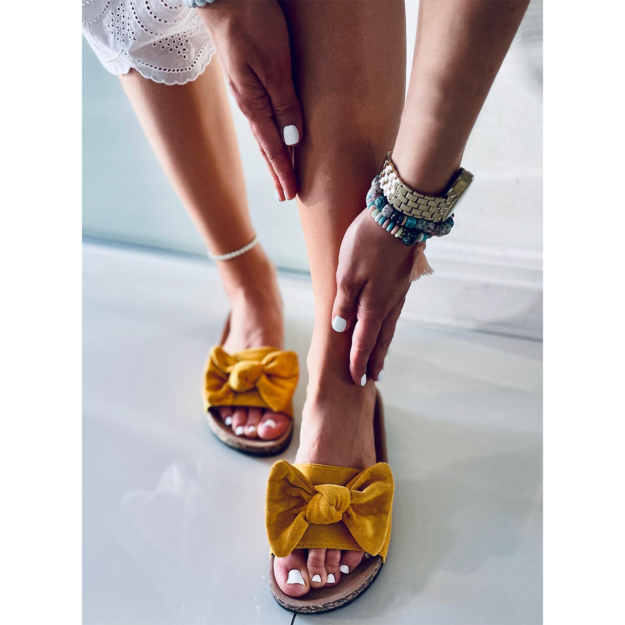Entdecken Sie sommerlichen Komfort und Stil mit den Kork-zehenstegsandalen Kiara Yellow! Diese einzigartigen Damen-zehenstegsandalen vereinen Eleganz und Funktionalität und sind somit die perfekte Wahl für alltägliche Ausflüge. Ein schlichtes, glattes Design in einem intensiven Gelbton, verziert mit einer dezenten Schleife, verleiht jedem Sommer-Styling Frische.