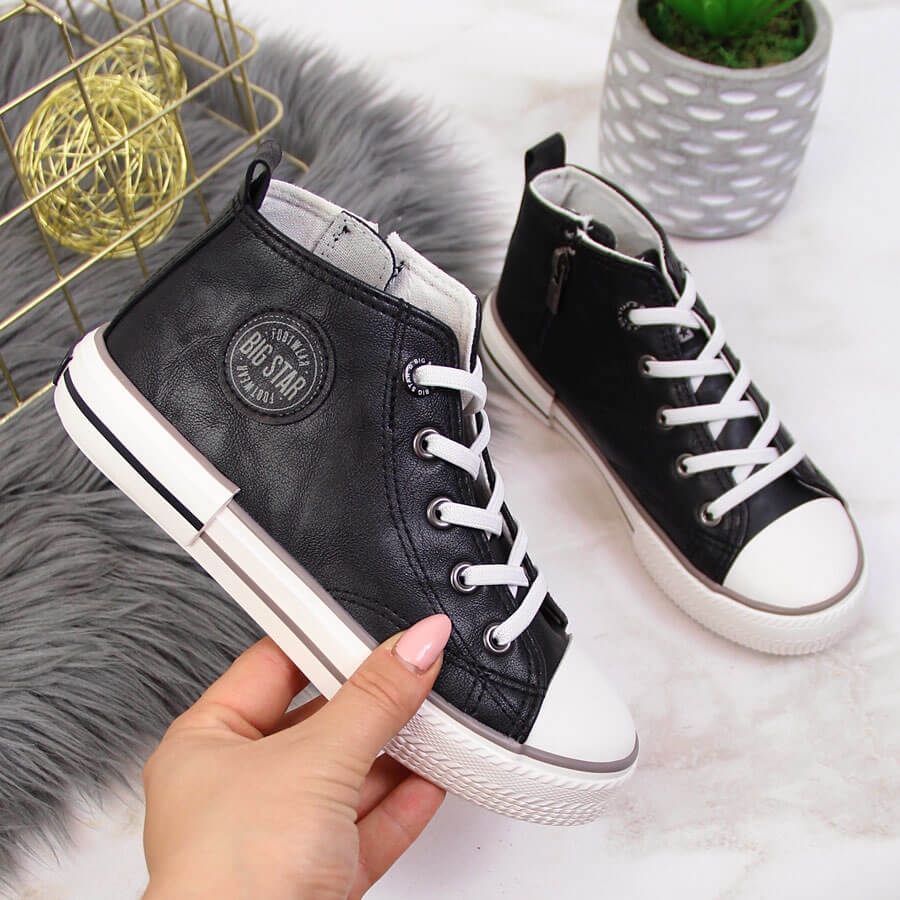 Kinder Sneakers Eco Leder Black Big Star II374003 - Komfort und Stil jeden Tag. Diese hohen Turnschuhe aus der Big Star Brand kombinieren einen klassischen Look mit praktischen Lösungen, wodurch sie beim Spielen und auf einem Spaziergang funktioniert.