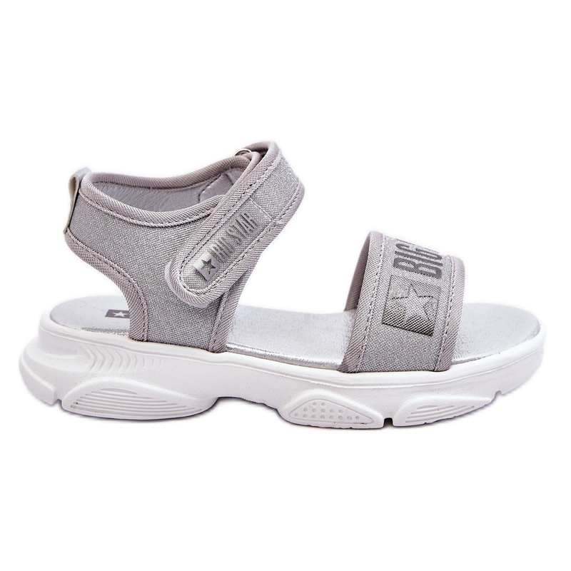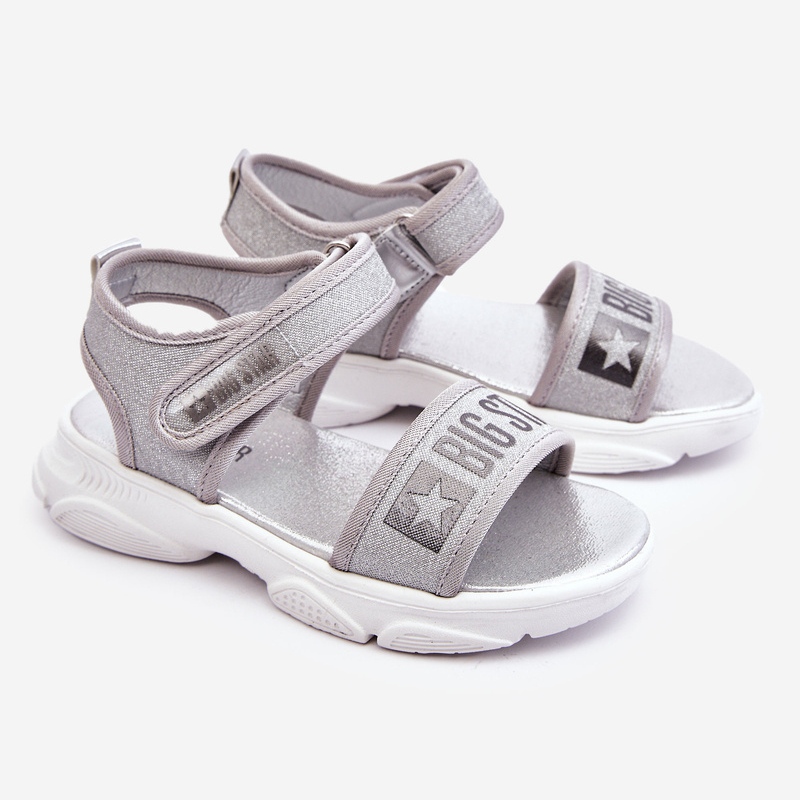 Big Star LL374194 Kindersandalen - Silber, glänzend und komfortabel - perfekt für warme Tage. Das obere aus Textilmaterial mit subtilem Brokatglanz macht jede Reise zum Spielplatz oder in der Familie noch angenehmer. Dank der praktischen Klettverschlüsse ist das Anziehen und die passenden Schuhe schnell und einfach, und ein weicher Materialeinsatz garantiert den ganzen Tag den Komfort. Die leichte Schaumstoffsohle absorbiert die Stufen und belastet das kleine Bein nicht.