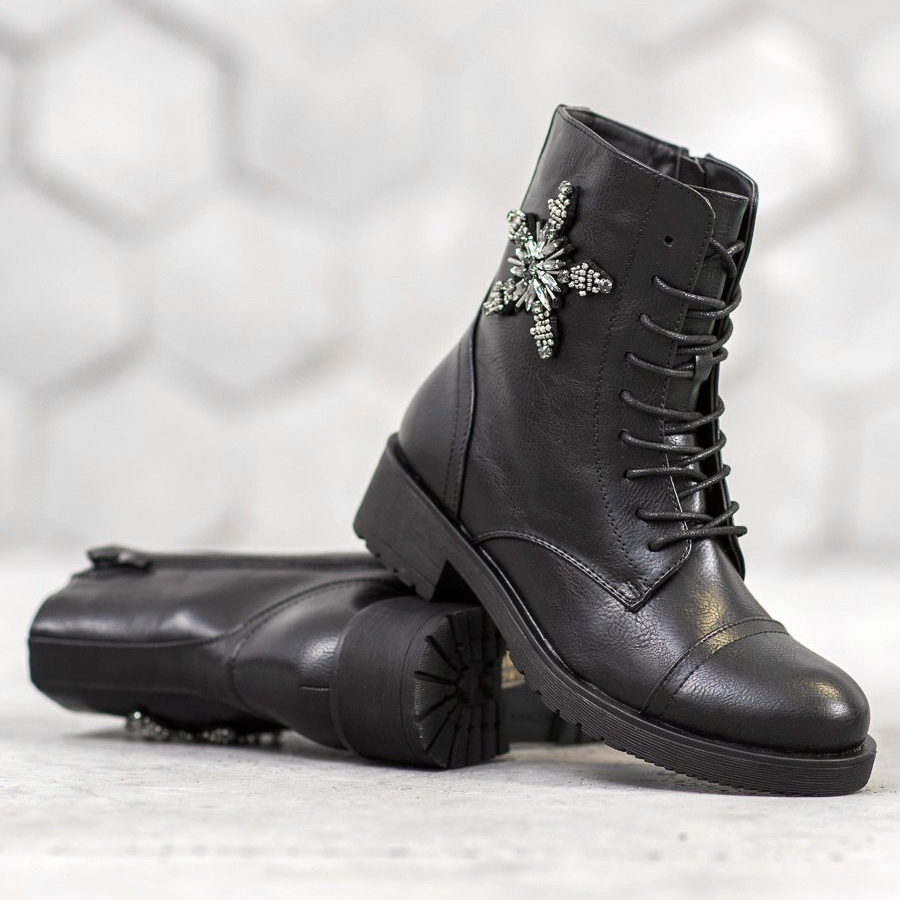 Ein eleganter Akzent in Form von dekorativen Kristallen hebt das Modell von anderen ab. Durch die universelle schwarze Farbe lassen sich die Arbeiterschuhe problemlos mit verschiedenen Outfits kombinieren, von lässig bis rockig. Dank eines flachen 4 cm hohen Absatzes bieten die Schuhe optimalen Tragekomfort.