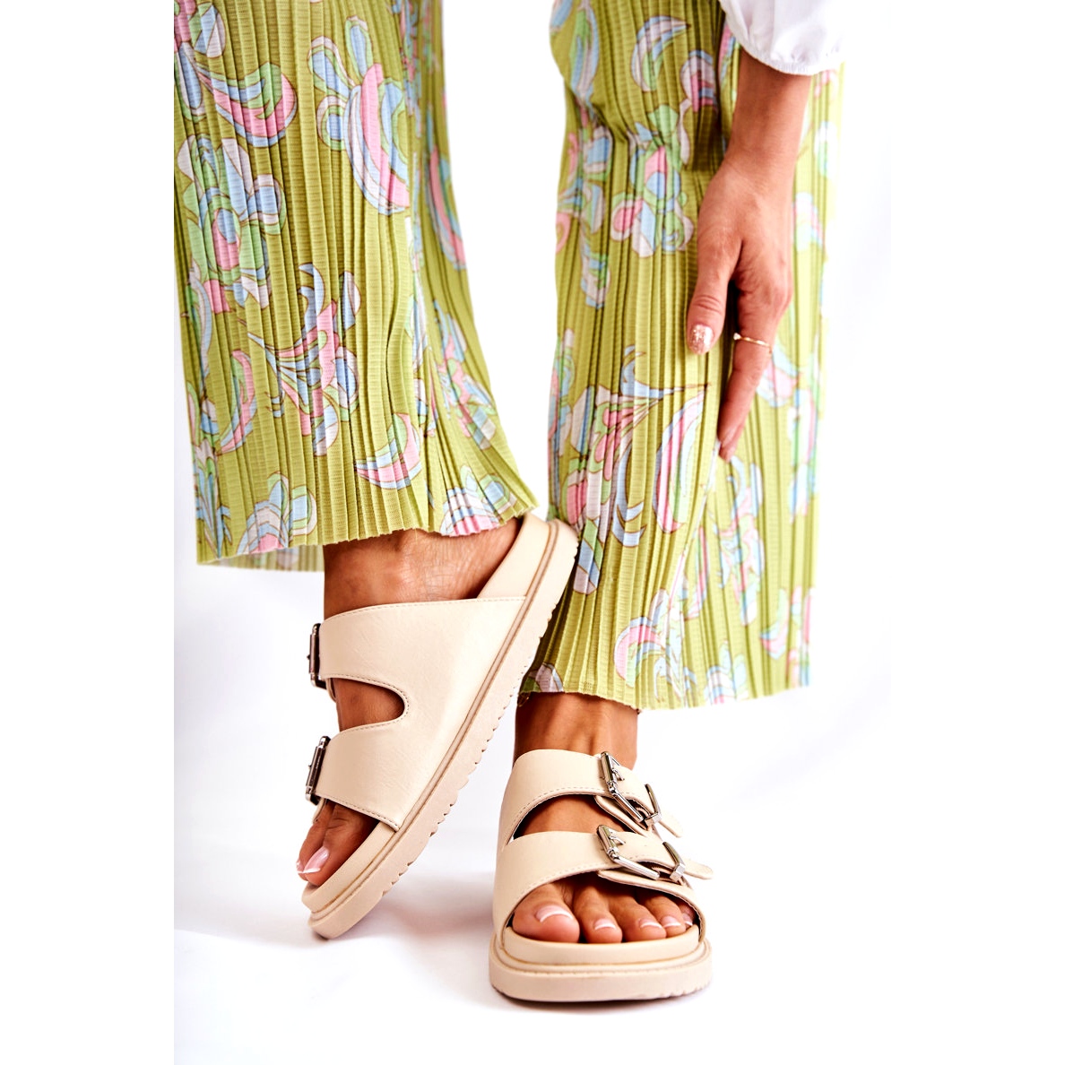 Sie sitzen auf einer flachen, dickeren Sohle und bieten Komfort über viele Stunden hinweg. Verstellbare Riemen vorne mit Schnallen sorgen für eine perfekte Passform am Fuß und erhöhen den Tragekomfort. Darüber hinaus garantiert die profilierte Gummi-Innensohle Halt für die Füße, was besonders an warmen Tagen wichtig ist.