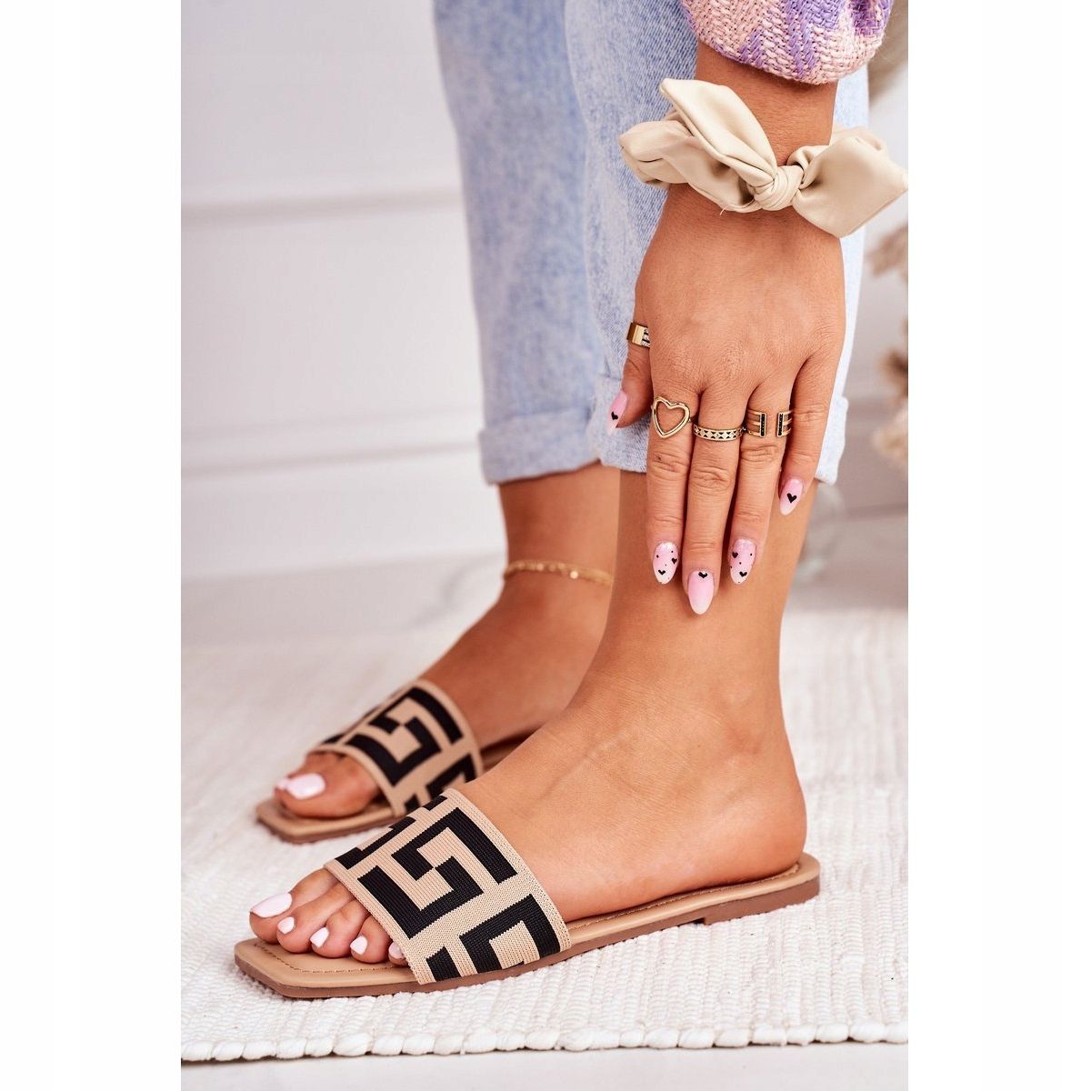 Die Innensohle aus Faux-Wildleder sorgt für Komfort und Weichheit beim Tragen und die rutschfeste Sohle sorgt für Sicherheit bei jedem Schritt. Das Modell Melinda zeichnet sich durch sein minimalistisches Design und das geometrische Muster aus, wodurch es sowohl zu legeren als auch zu eleganteren Outfits perfekt passt.