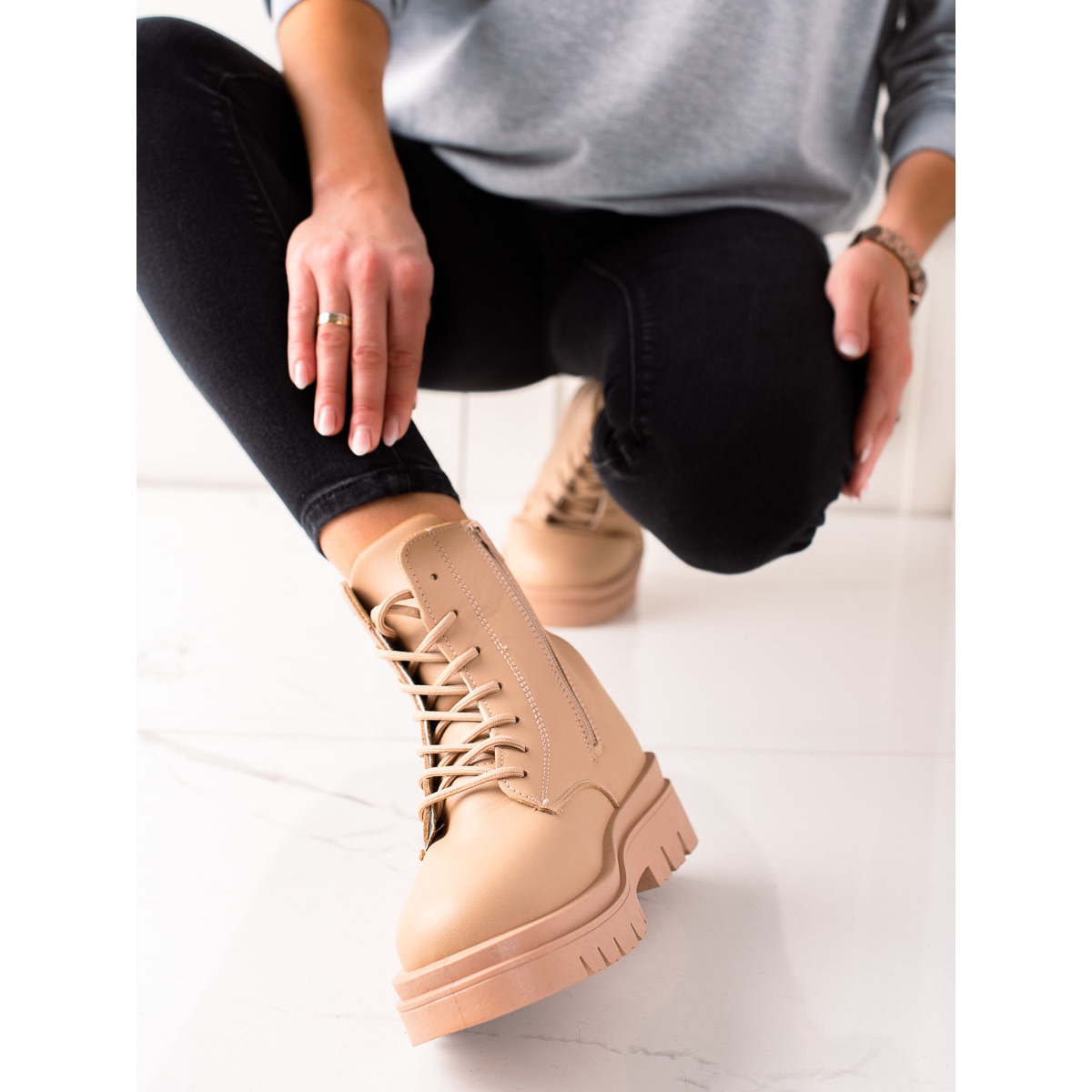 Ein 3 cm hohes Plateau kombiniert mit einem flachen Absatz (5 cm) garantiert Stabilität und Komfort bei jedem Schritt. Der praktische Reißverschluss und die Schnürung ermöglichen ein schnelles und problemloses An- und Ausziehen der Schuhe.