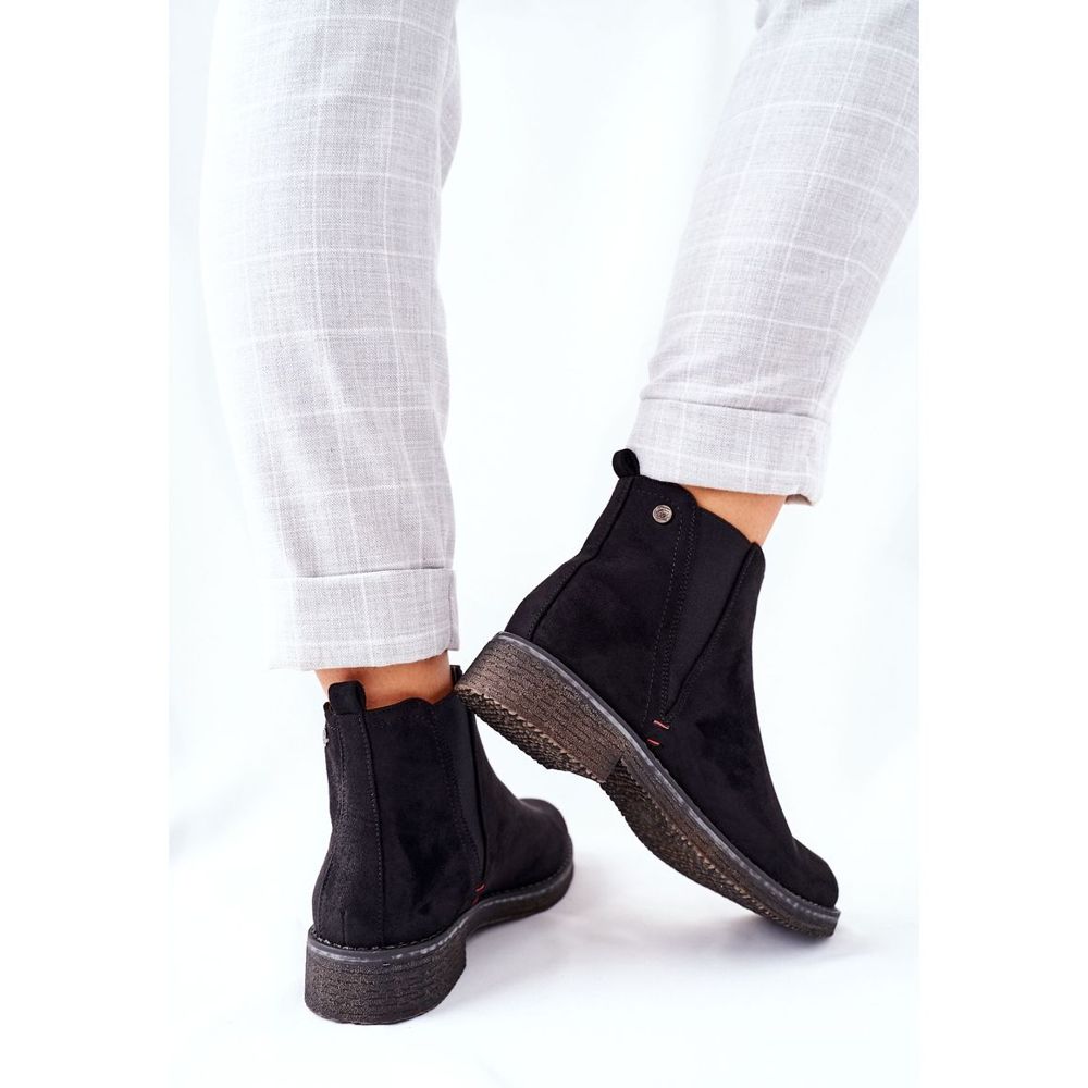 Entdecken Sie klassische Damen-Chelsea-Stiefel aus schwarzem Wildleder des Modells Heather, die die perfekte Ergänzung zu jedem Styling sind. Diese eleganten Stiefel aus hochwertigem Öko-Wildleder zeichnen sich sowohl durch Ästhetik als auch durch Tragekomfort aus. Dank des flachen 3,5-cm-Absatzes können Sie sich jeden Tag frei bewegen, ohne auf einen modischen Look zu verzichten.