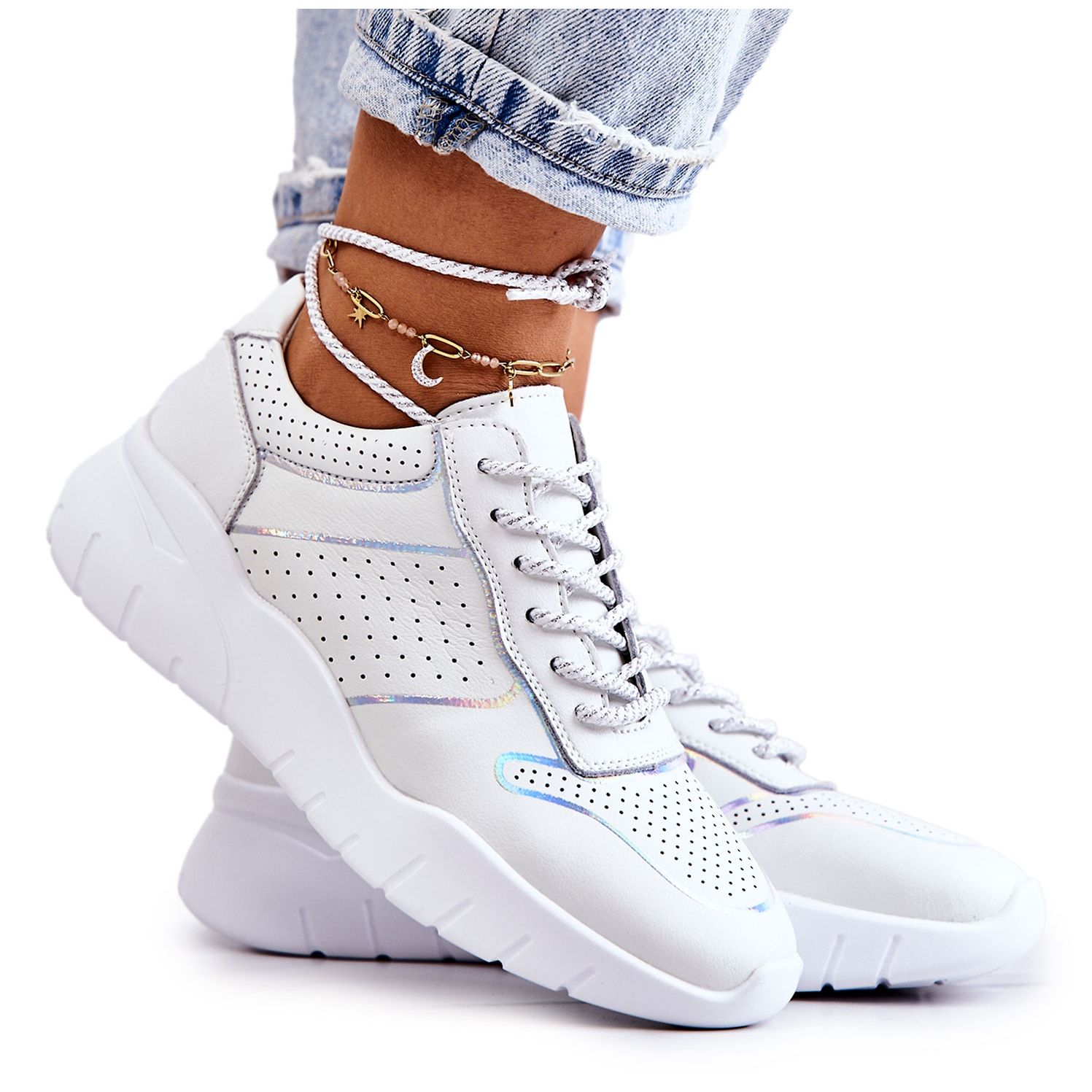 S. Barski Carly - Klassische weiße Turnschuhe in Weiß, die Sportkomfort mit einem subtilen, modischen Finish kombinieren. Sie bestehen aus natürlichen, perforierten Leder und bieten eine gute Luftentwässerung und einen eleganten Look. Der weiche Einsatz von natürlichen Leder garantiert den ganzen Tag aus Komfort, und die leicht verlängerte runde Nase und Schnürung für runde Schnürsenkel betonen ihren universellen Charakter. Holographische Einsätze am oberen Hinzufügen fügen einen modernen Akzent hinzu.