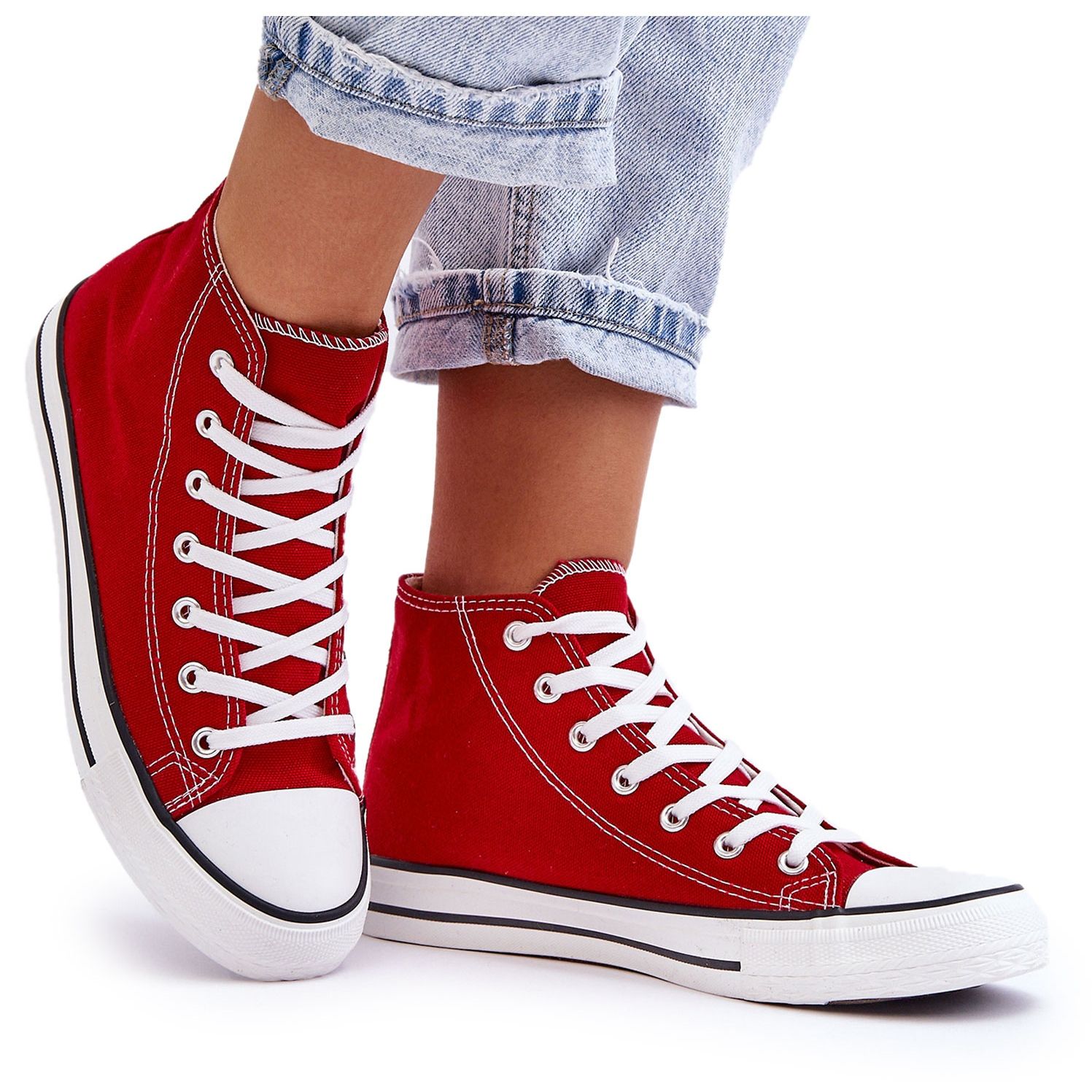 Klassische, zeitlose Knöchel -Turnschuhe in einer intensiven, roten Farbe mit weißen Akzenten. Hergestellt aus strapazierfähigem Stoff, mit einem Gummi, einer Nicht -Slip -Sohle und einem verstärkten Gummi -Zeh - täglich perfekt für Freizeitstile und Stadtspaziergänge. Modell für einen schlanken Fuß; Befolgen Sie bei der Auswahl einer Größe die Größentabelle.