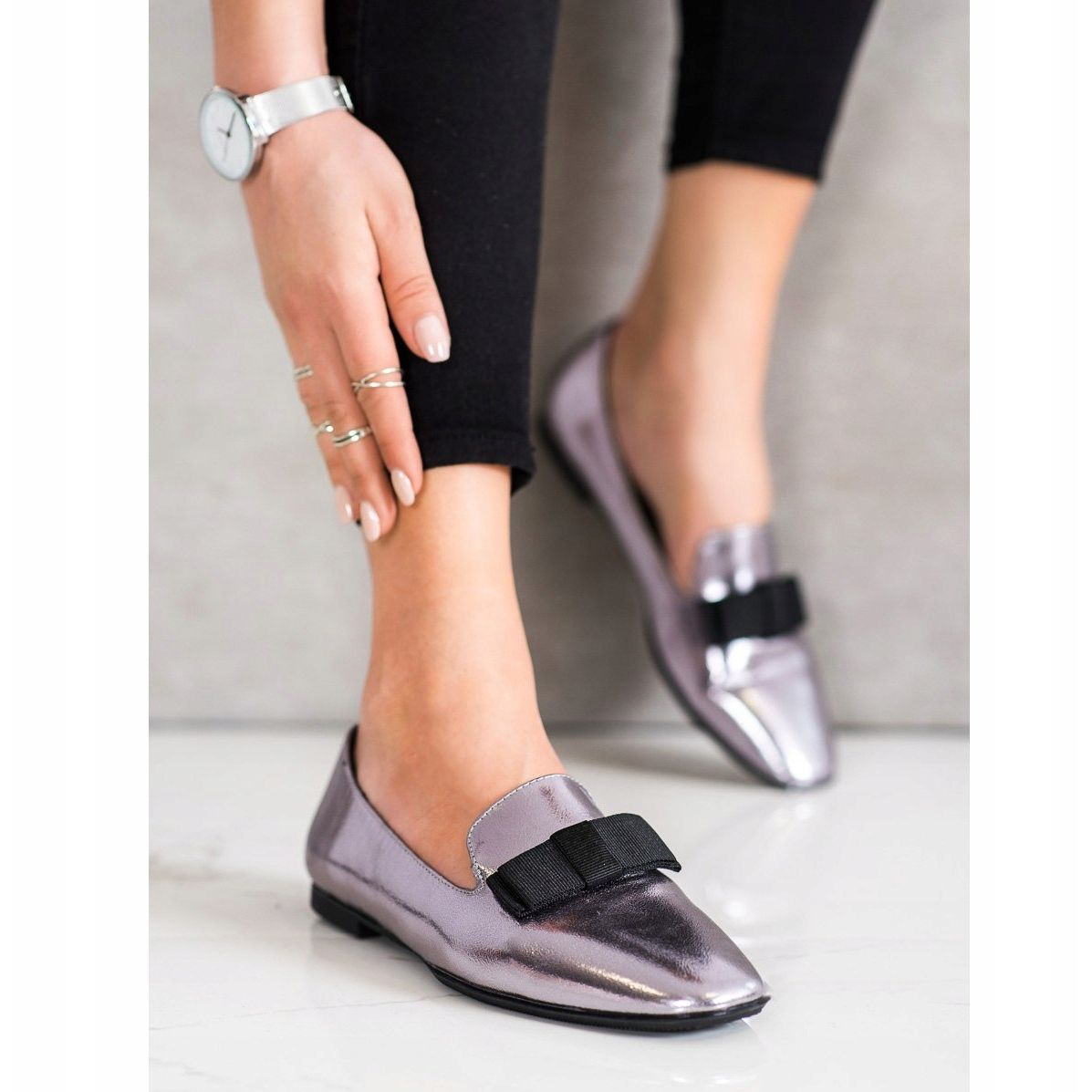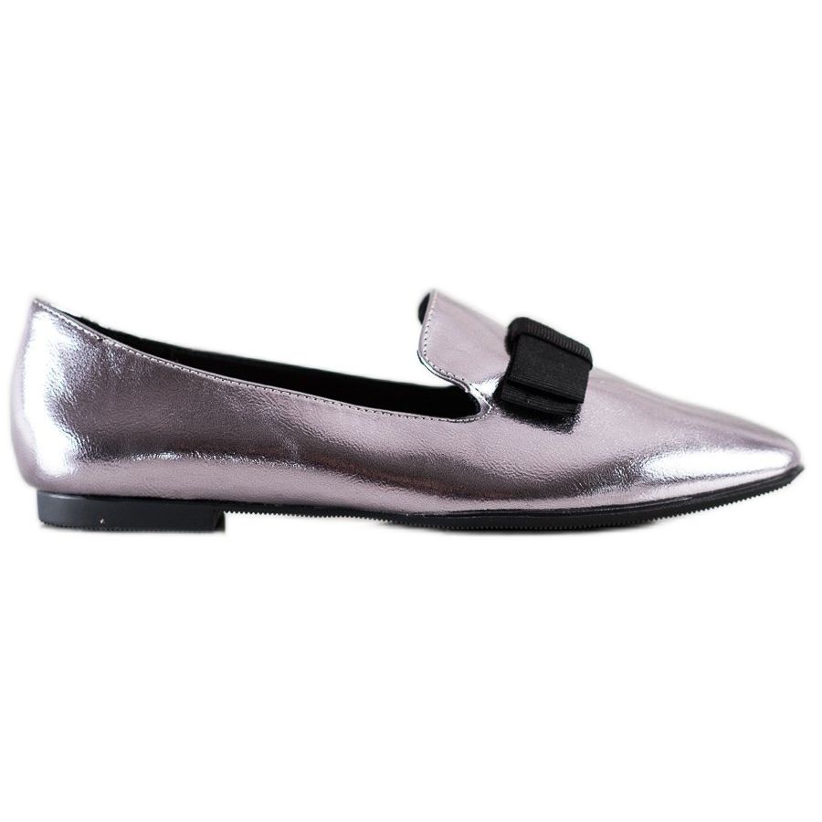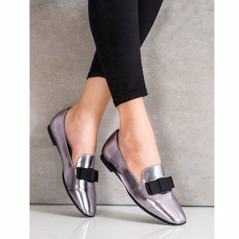 Ein charakteristisches Element dieses Modells ist eine dekorative Schleife aus einem breiten schwarzen Band, die den Schuhen einen einzigartigen Charme verleiht. Scharf gerundete Spitzen und eine eingearbeitete, weiche Fersenkappe sorgen nicht nur für ein ästhetisches Erscheinungsbild, sondern auch für Tragekomfort. Dank des Slip-On-Verschlusses ist das An- und Ausziehen ein reines Vergnügen.