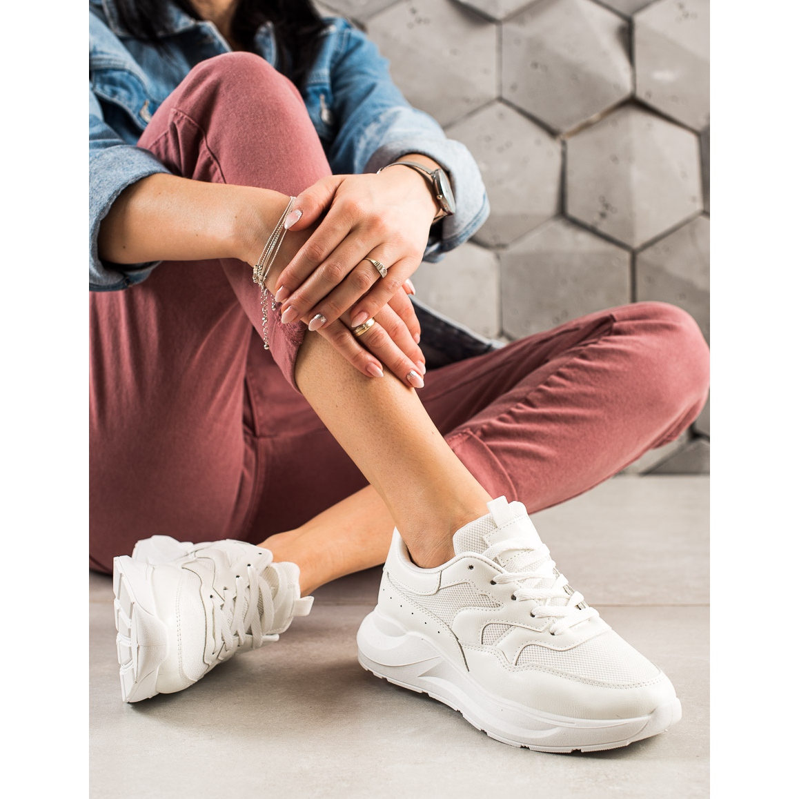 Weiße TRENDI-Sneaker funktionieren in vielen Situationen gut – sie passen perfekt sowohl zu Sportstilen als auch zu lässigen Outfits, perfekt für Treffen mit Freunden. Dank ihrer Universalität sind sie ein Muss in der Garderobe jeder Frau.