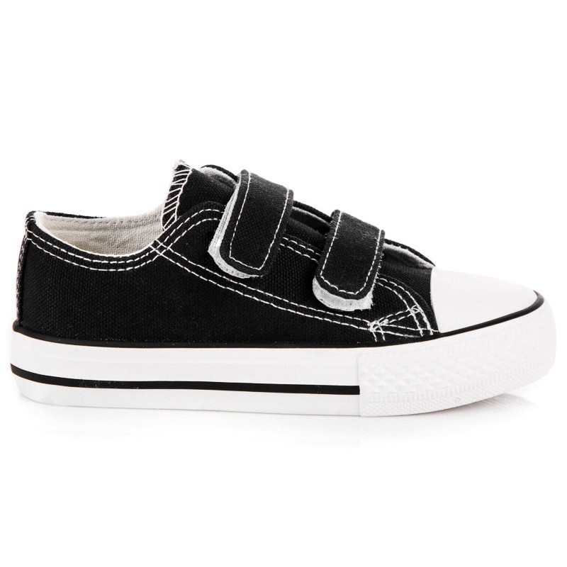 Praktische und universelle Klett-Sneaker in klassischem Schwarz – perfekt für jedes aktive Mädchen und jeden aktiven Jungen. Aus strapazierfähigem Textilgewebe, mit kontrastierender weißer Spitze und weißer Gummisohle mit Profil. Das sportliche, flache Profil der Sohle sorgt für Komfort beim Spielen und bei alltäglichen Aktivitäten.