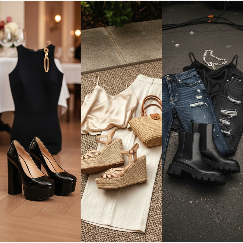 Wenn Sie eine kleine Statur haben, können massive Plattformen Ihre Figur optisch überfordern. Wählen Sie Modelle mit einer mäßig dicken Sohle (ca. 3–5 cm) und in hellen Farben, die keinen zu starken Kontrast zum Rest des Outfits bilden. Vermeiden Sie sehr breite Sohlen, da diese Ihre Beine voluminöser wirken lassen können.