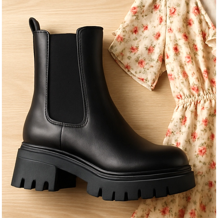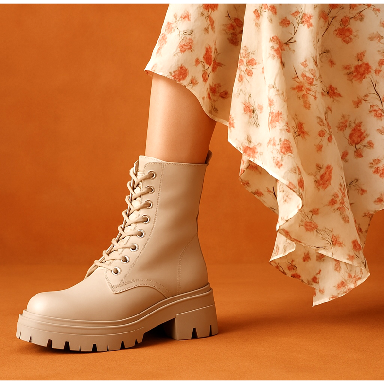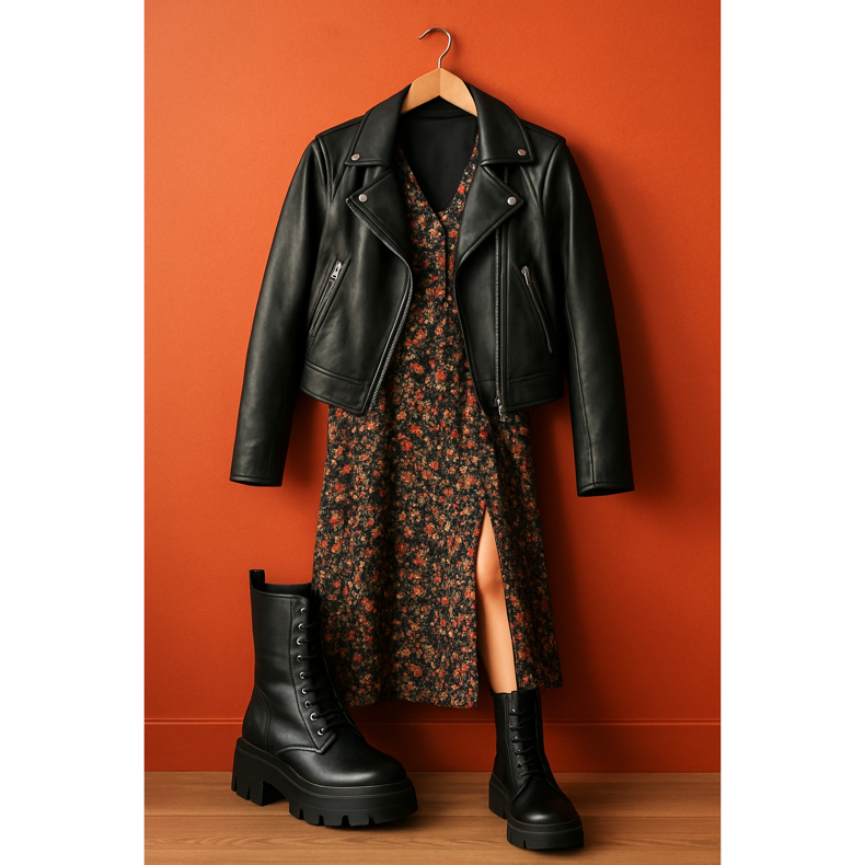 Die Kombination aus schweren Arbeiterstiefeln und einem zarten Blumenkleid ist ein Klassiker, der immer funktioniert. Wählen Sie ein Midi- oder Maxikleid mit einem Schlitz, der das Obermaterial des Schuhs freigibt. Fügen Sie eine Leder-Bikerjacke oder eine übergroße Jacke hinzu. Dieses Set ist die perfekte Balance zwischen Rock-Stil und romantischer Mädchenhaftigkeit. Denken Sie daran, es nicht mit Accessoires zu übertreiben – Schuhe setzen hier einen ausreichend starken Akzent.