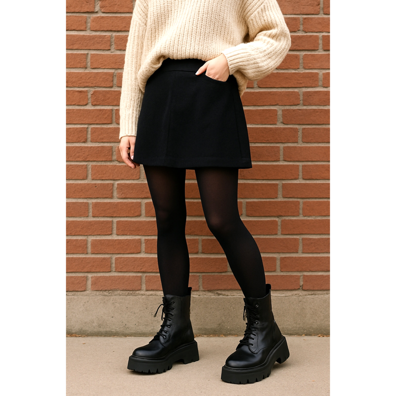 Auch zu kurzen Miniröcken sehen klobige Stiefel toll aus. Um einen vulgären Effekt zu vermeiden, wählen Sie eine dicke, schwarze Strumpfhose (blickdicht) und ein lockereres Oberteil, z.B. ein dicker Strickpullover, der teilweise hinter dem Gürtel verstaut war. Die dicke Sohle macht die Beine optisch schlanker und der hohe Schaft verleiht Charakter. Dies ist der perfekte Stil für Herbstspaziergänge oder Treffen mit Freunden.
