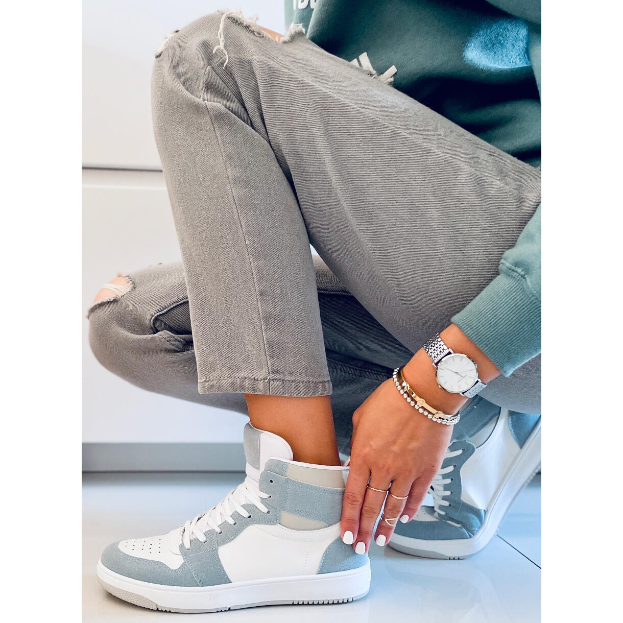 Wir präsentieren einzigartige Dorcas Green High-Top-Sneaker in Weiß und Blau vom Hersteller PA1, die perfekt zu den Trends dieses Frühlings und Sommers passen! Diese Schnürschuhe sind nicht nur ein Hingucker im Alltags-Styling, sondern auch bequemes Schuhwerk für aktive Frauen.