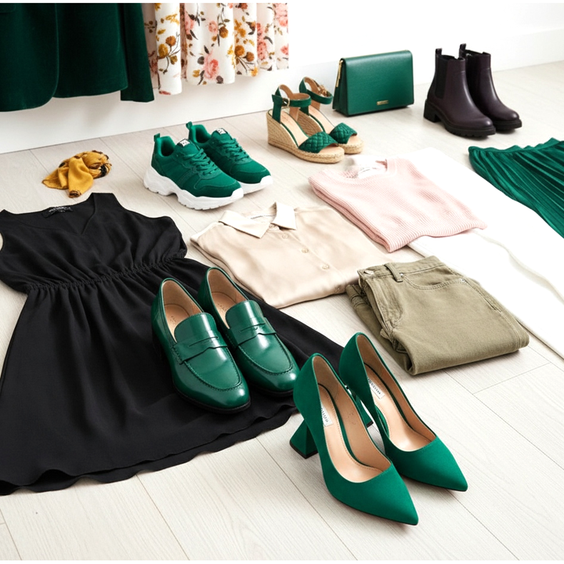 Für ein lässigeres Styling: Smaragdgrüne Slipper mit Khaki-Jeans und einer beigen Bluse sind eine sehr verständnisvolle Kombination. Smaragdgrüne Sneakers bilden einen perfekten Kontrast zu weißen Hosen und einem pastellfarbenen Oberteil. Smaragdgrüne Keilsandaletten sind perfekt für Sommerpartys – mit einem Blumenkleid oder einem schlichten cremefarbenen Kleid.