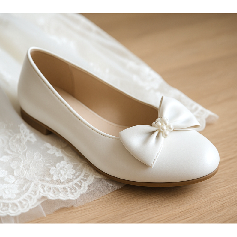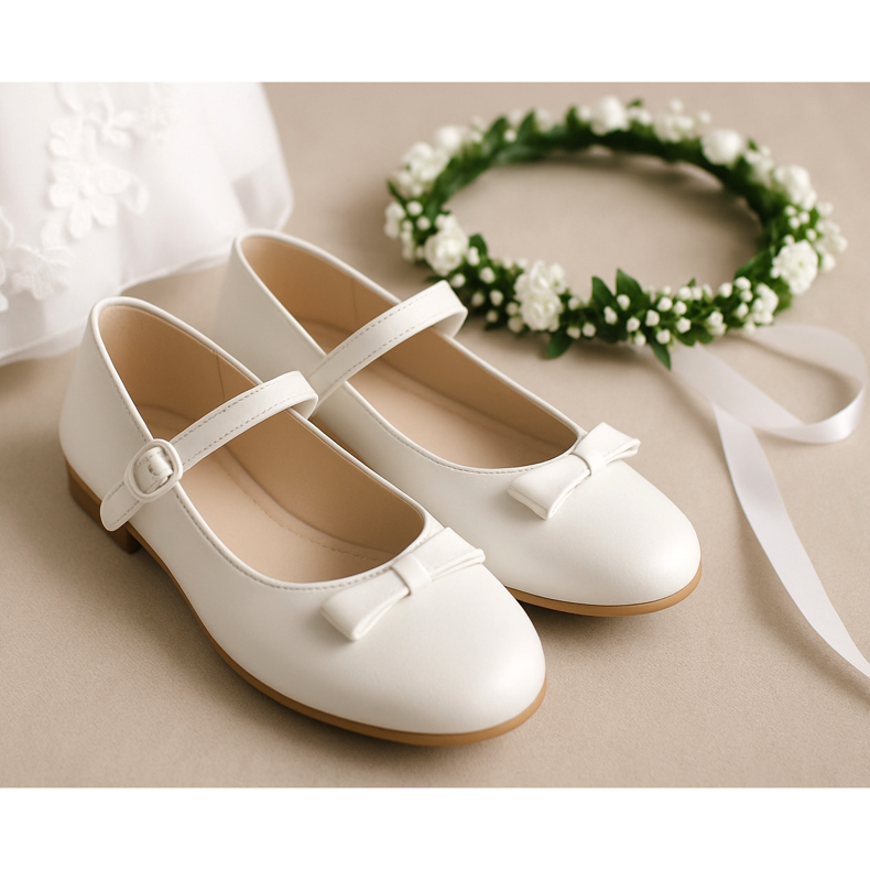 Ballerinas sind ein Klassiker unter den Kommunionschuhen für Mädchen, und diese Lösung wird immer noch verwendet, da sie äußerst elegant und bequem sind. Weiße oder cremefarbene Ballerinas sind die beliebteste Wahl, da sie zu praktisch jedem weißen oder cremefarbenen Kommunionkleid passen. Diese Schuhe bieten maximalen Komfort – das Mädchen kann darin viele Stunden lang ohne Fußschmerzen laufen. Viele Marken bieten Ballerinas mit zarten Accessoires wie Schleifen, Spitze oder Perlen an, die Eleganz verleihen, ohne an Komfort zu verlieren. Wenn Sie auf der Suche nach einem traditionellen Ansatz sind, sind Ballerinas definitiv die beste Wahl. Denken Sie jedoch daran, Schuhe aus Naturleder oder hochwertigem Material zu wählen, die atmungsaktiv und weich für den Fuß des Mädchens sind. Solche Ballerinas werden ihr nicht zu eng sein und sie wird ihren besonderen Tag in vollen Zügen genießen können. Sie können auch mit Accessoires verziert werden, die zum Anstand des Kleides passen – zum Beispiel einem zarten Gürtel oder einer Schleife.