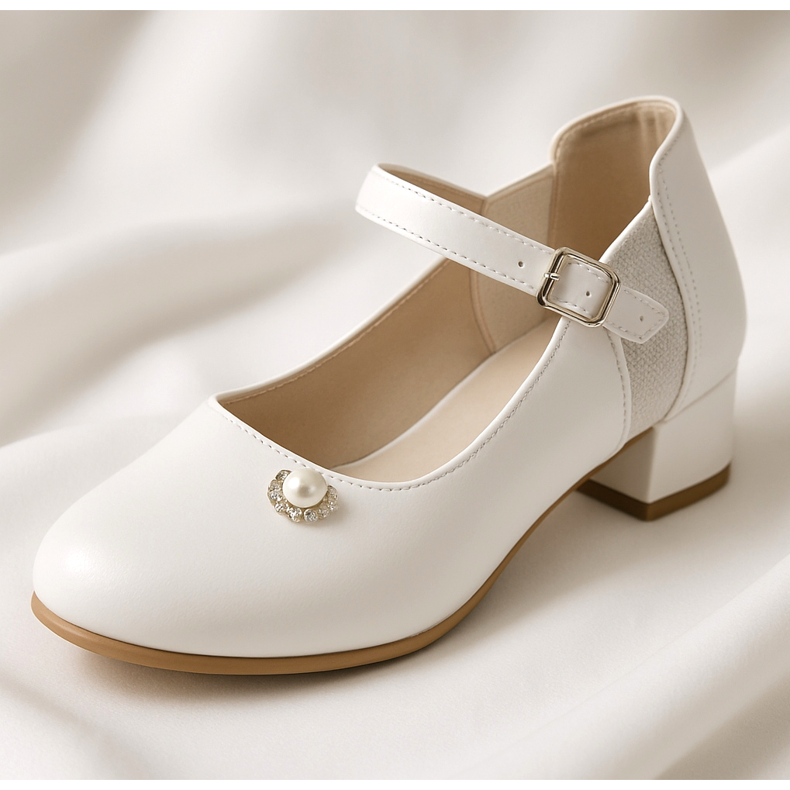 Wenn Sie möchten, dass Ihre Tochter erwachsener aussieht, können Sie sich für Schuhe mit niedrigen Absätzen entscheiden. Diese Schuhe bieten ein etwas höheres Maß an Eleganz als Ballerinas und sind dennoch äußerst bequem für Ihr Kind. Der Absatz sollte sehr niedrig sein – nur 2-3 cm – damit sich das Mädchen sicher bewegen kann. Beliebt sind Pumps mit abgerundeter Spitze oder Stiefeletten mit elastischen Einsätzen, die für Komfort und guten Halt sorgen. Diese Schuhe können weiß, creme, beige oder sogar ganz leicht grau sein – wichtig ist, dass sie zur Farbpalette des Kommunionkleides passen. Die Zehenabsätze können auch mit Perlen, Pailletten oder anderen zarten Accessoires verziert werden, die die Eleganz des Schuhs unterstreichen, ohne ihn zu überfordern. Diese Art von Schuhen ist besonders bei älteren Mädchen beliebt, die eher wie Teenager aussehen, aber dennoch praktisch und bequem bleiben möchten.