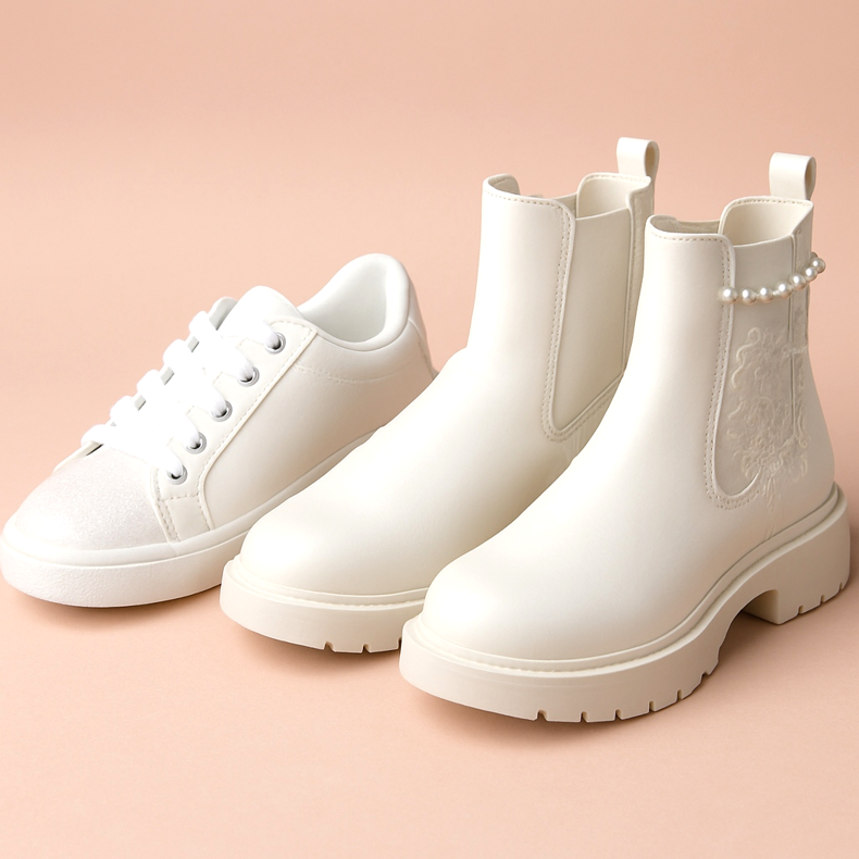Die Trends für 2025/2026 bringen immer modernere Ansätze für Kommunionschuhe. Weiße Turnschuhe sind eine frische Alternative zu herkömmlichen Ballerinas, insbesondere wenn das Mädchen ein informelleres Kommunionkleid trägt oder wenn ihre Familie einen entspannteren Stil bevorzugt. Die Sneaker sind äußerst bequem und bieten den Füßen Ihres Kindes den ganzen Tag über perfekten Halt. Sie können mit glänzenden Elementen oder dezenten Verzierungen verziert werden, um der Eleganz des Anlasses gerecht zu werden. Stiefeletten mit elastischen Einsätzen oder Plateau sind eine weitere Option, die sich immer größerer Beliebtheit erfreut. Sie können aus ökologischem Leder gefertigt sein und mit zarten Zusätzen wie Spitze oder Perlen versehen sein, die ihnen Charme verleihen, ohne das Kind zu überfordern.