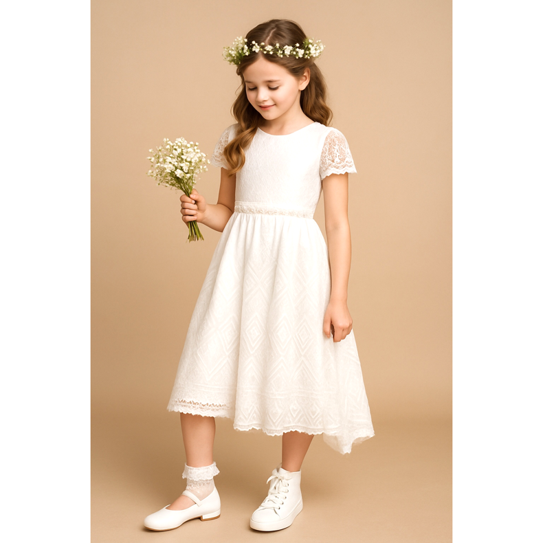 Vergessen Sie bei der Wahl der Kommunionschuhe nicht das restliche Styling. Weiße Ballerinas passen perfekt zu einem traditionellen weißen Kommunionkleid mit Spitzenaccessoires und einem dekorativen Gürtel. Wenn Sie sich für Sneakers entscheiden, können diese mit einem moderneren Kommunionkleid im Boho-Stil oder mit geometrischen Mustern gut aussehen. Stiefeletten passen zu Kleidern mit ausgeprägterem Dekor oder Fransen. Vergessen Sie auch die Socken nicht – weiße Socken bleiben eine klassische Wahl, Sie können aber auch mit kleinen Mustern oder Spitzensocken experimentieren, wenn sie zum Rest Ihres Outfits passen. Vergessen Sie nicht das gesamte Styling – Schmuck, eine Frisur und ein kleiner Blumenstrauß sind die Elemente, die den eleganten Look ergänzen. Schuhe sollten nur den gesamten Look ergänzen, nicht seinen Hauptcharakter.