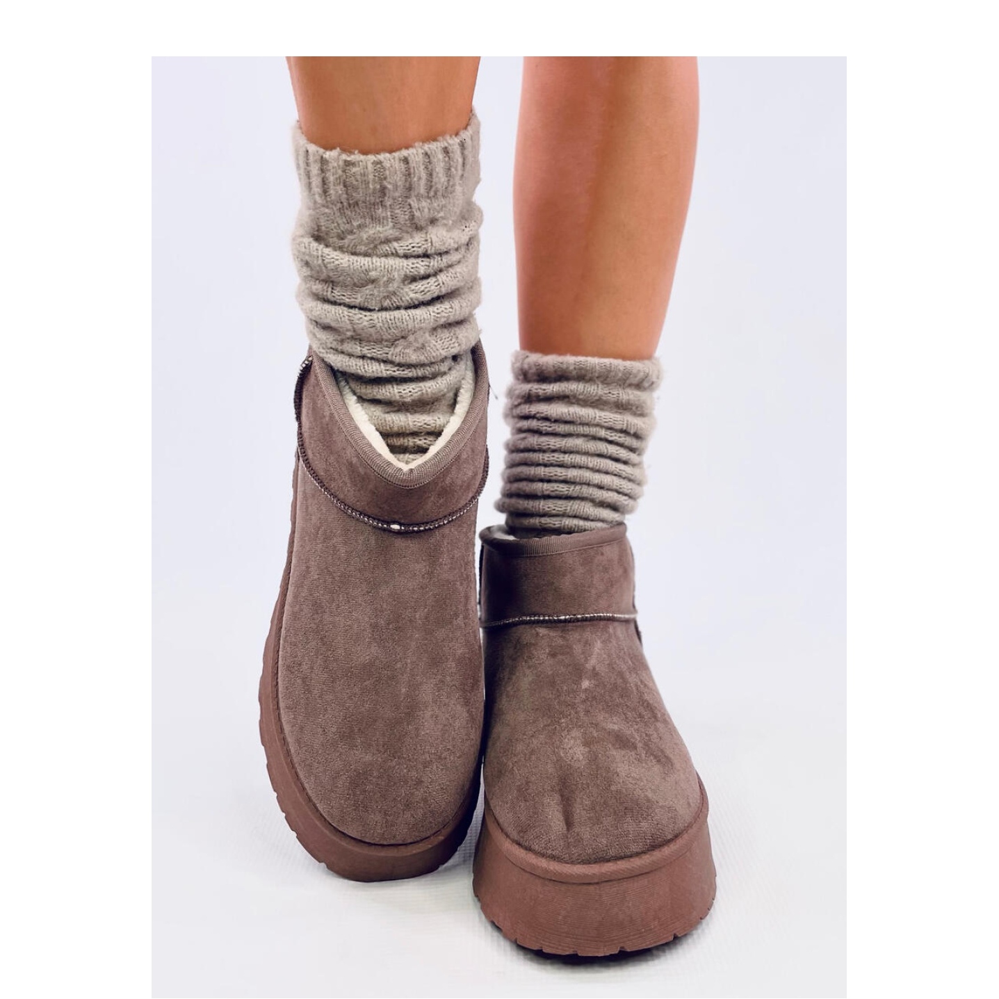 Sie bestehen aus ökologischem Wildleder und zeichnen sich nicht nur durch ein modisches Erscheinungsbild, sondern auch durch die Pflege der Umwelt aus. Das Innere der Schuhe ist mit dickem Fell isoliert, was effektiv vor Kälte schützt und gleichzeitig Weichheit und Vergnügen des Tragens verleiht. Dank der erhöhten Sohle mit einer Höhe von 4,5 cm erhalten Sie eine hervorragende Isolierung von einem kalten Boden, wodurch Sie Schritte in diesen E2 ergreifen können. Sie können jeden Moment im Freien genießen.