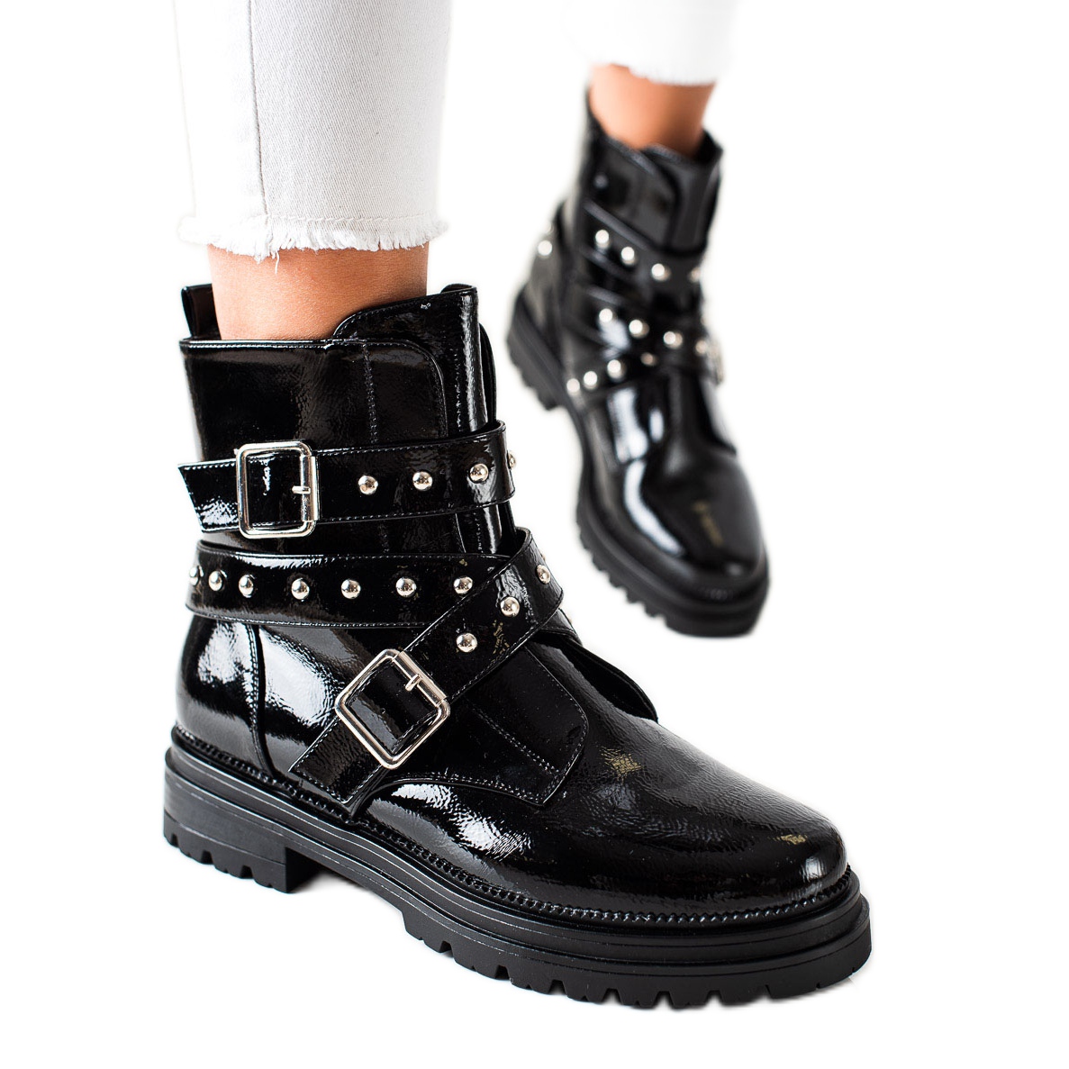 Wir präsentieren schwarz lackierte Arbeiterschuhe mit Strasssteinen, die eine perfekte Wahl für Frauen sind, die Wert auf Stil und Komfort legen. Diese einzigartigen Stiefel des renommierten Herstellers Bestelle vereinen Rock-Charakter mit Alltagsfunktionalität und sind damit die perfekte Ergänzung für jedes Herbst-Winter-Styling.