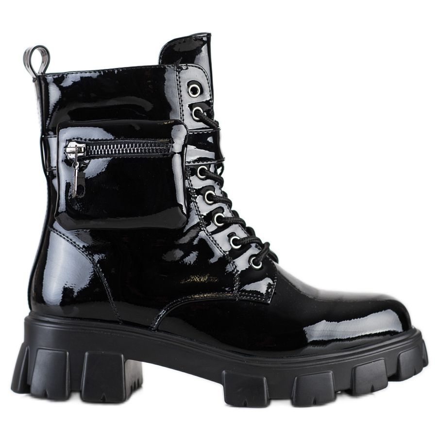 Die Stiefel werden mit einem Reißverschluss geschlossen und geschnürt, was eine einfache Anpassung an den Fuß und eine schnelle Bedienung ermöglicht. Durch ihre universelle schwarze Farbe passen sie zu praktisch jedem Styling und das lackierte Material verleiht ihnen einen modischen, modernen Look.
