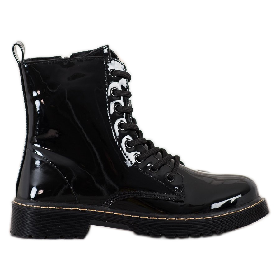 Wir präsentieren Small Swan Patent Workers-Stiefel in elegantem Schwarz, die eine perfekte Kombination aus lässigem und rockigem Stil darstellen. Diese einzigartigen Damenschuhe, die für die Herbst-/Wintersaison entworfen wurden, sind die perfekte Wahl für den täglichen Gebrauch und verleihen jedem Styling Charakter.