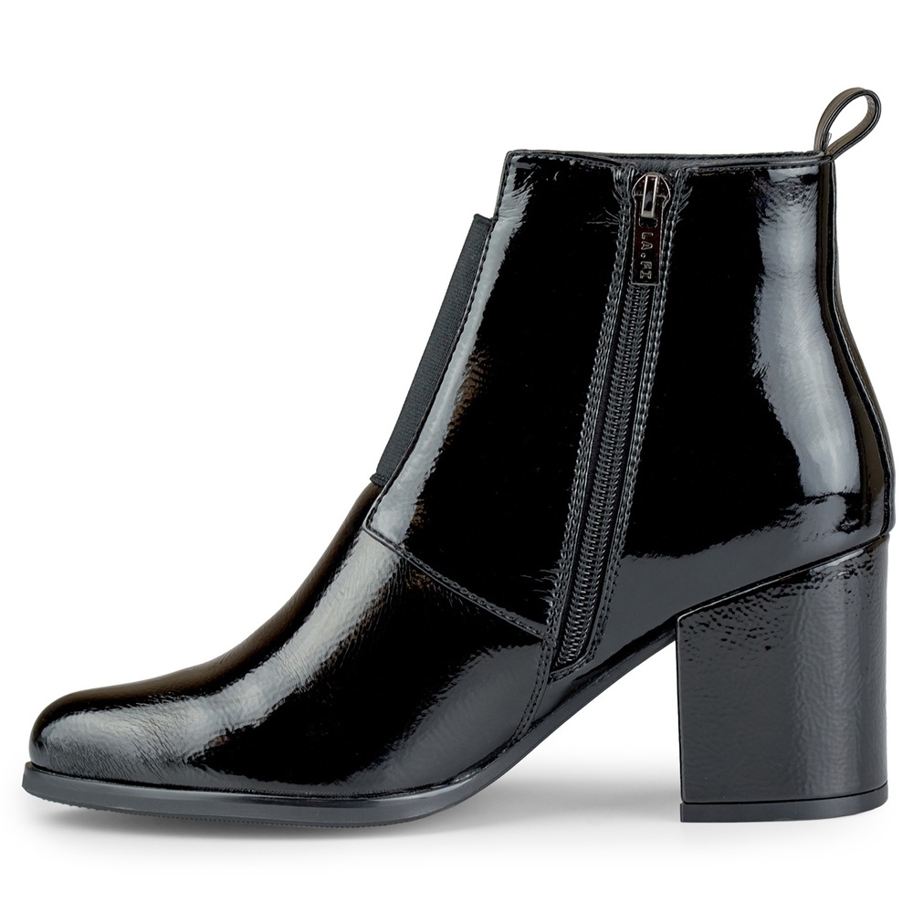 Wir bieten Ihnen stilvolle und elegante schwarze Damenstiefeletten mit Lackfinish, die sowohl Komfort als auch einen modischen Look in der Herbst- und Wintersaison garantieren. Diese flexiblen Stiefeletten sind die Quintessenz eines Alltagsklassikers mit modischem Touch, der jedes urbane Styling perfekt ergänzt. Der einzigartige Charakter des Schuhwerks wird durch das glänzende Obermaterial aus ökologischem Wildleder unterstrichen, das einen schönen Kontrast zum Herbst-Winter-Wetter bildet.