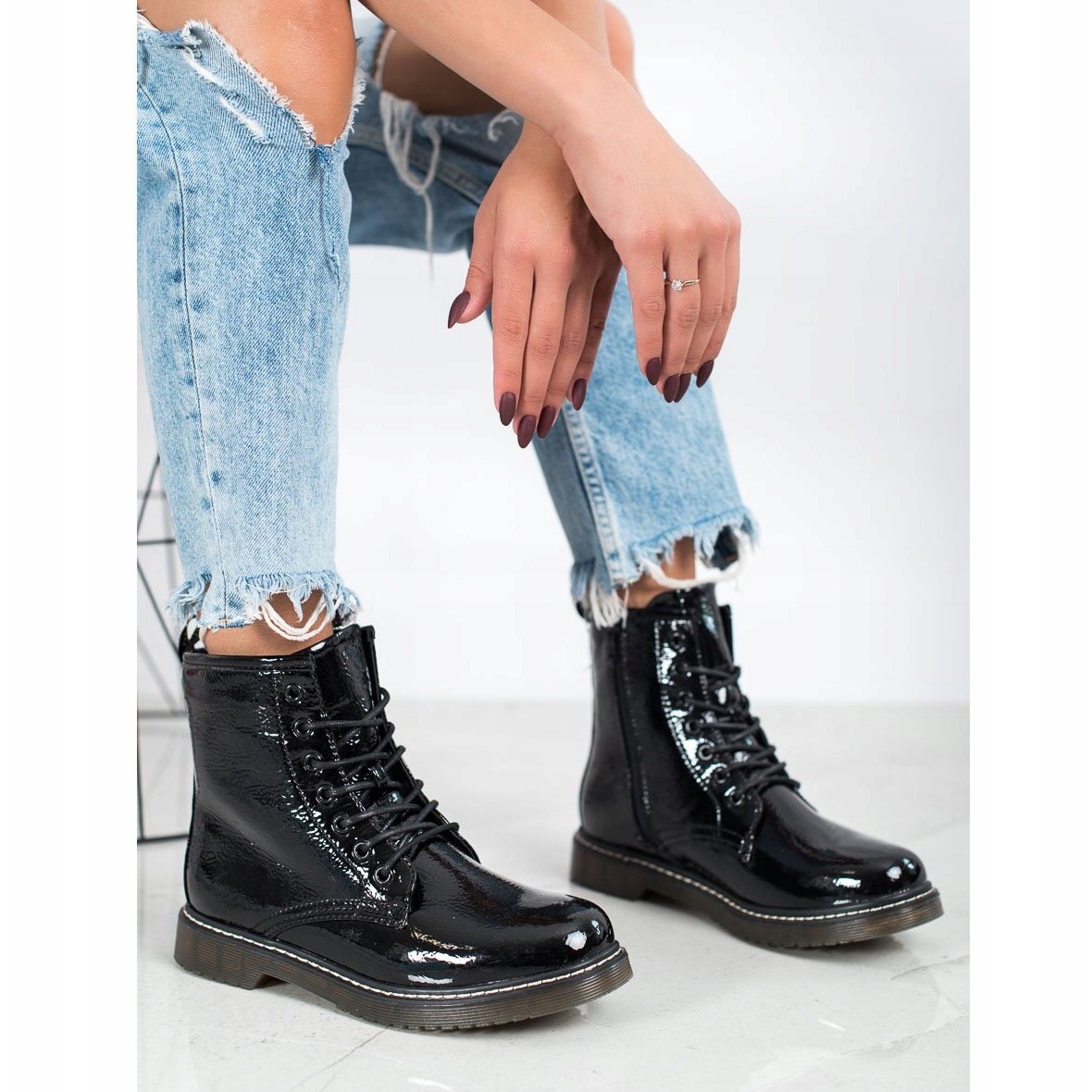 Die Designer von Evento haben verstanden, dass eine moderne Frau Schuhe braucht, die nicht nur gut aussehen, sondern auch im Alltag Komfort und Haltbarkeit bieten. Aus diesem Grund haben sie diese Lackleder-Worker in der klassischen schwarzen Farbe kreiert, die in der Welt der Damenmode ein Synonym für Vielseitigkeit und Langlebigkeit sind.