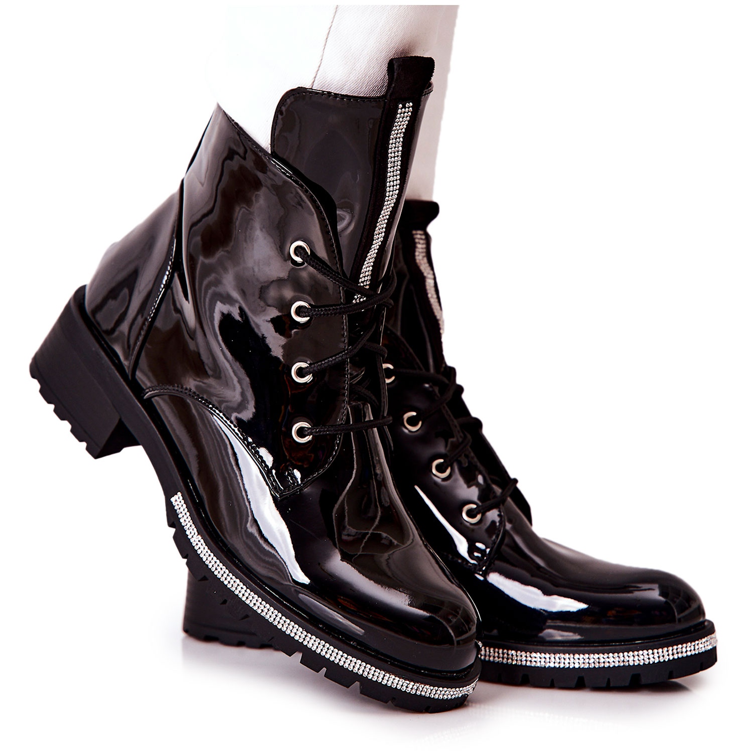Wir präsentieren elegante Stiefel des Grecia-Modells, die Stil mit Funktionalität verbinden. Diese schwarzen Stiefeletten aus Lackleder sind die perfekte Wahl für jede modebewusste Frau, die sich von der Masse abheben möchte. Ihr originelles Design, angereichert mit dekorativen Strasssteinen auf der Zunge und rund um die Sohlen, macht jeden Schritt einzigartig.
