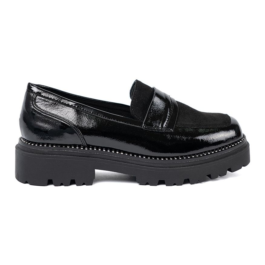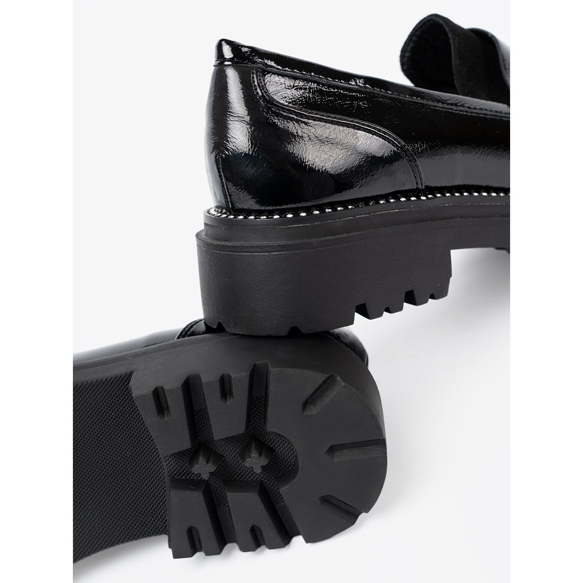Entdecken Sie Eleganz und Komfort dank schwarzer, lackierter Mokassins mit Bolzen der Marke Goodin. Diese stilvollen Frauenschuhe kombinieren klassisches Design mit modernen Akzenten, was sie täglich zu einer idealen Wahl macht, sowie für elegantere Anlässe.