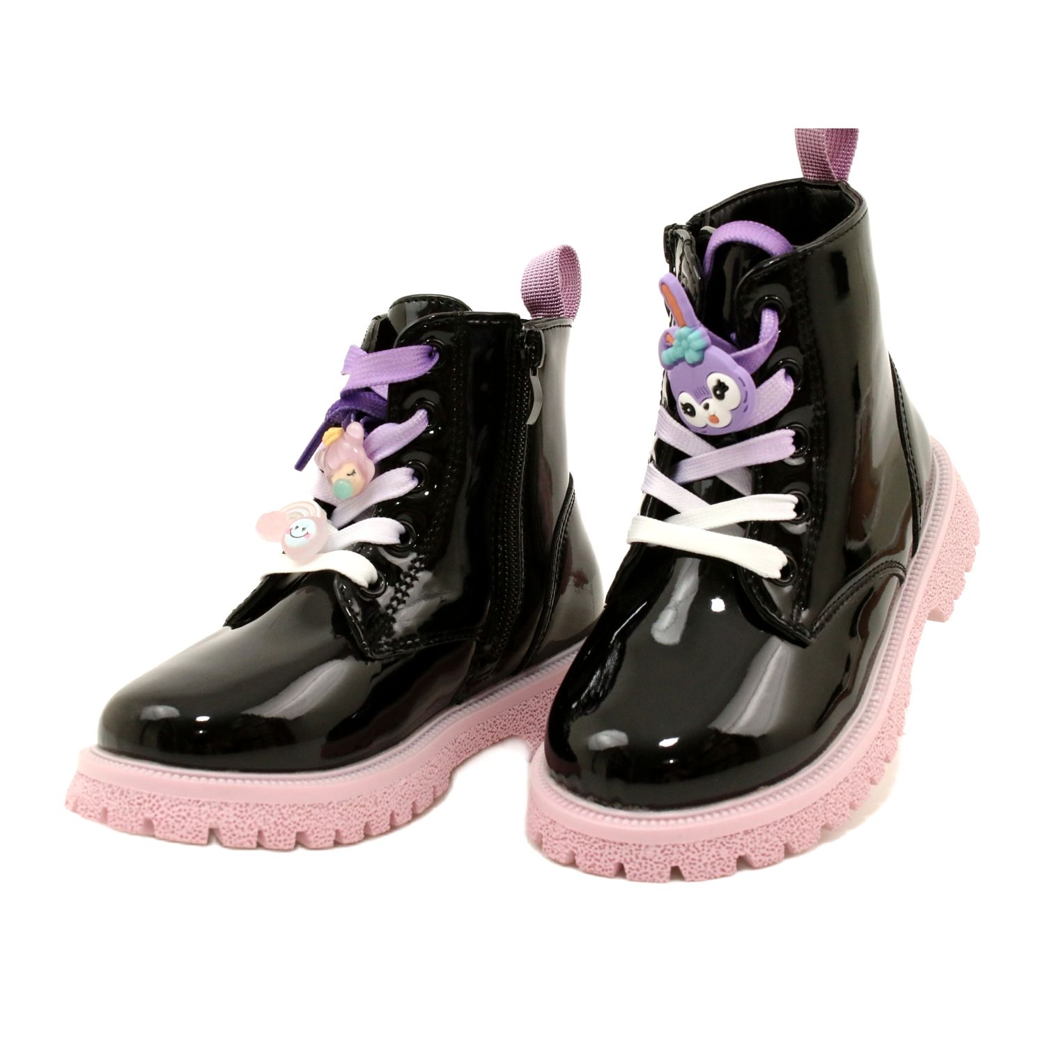 Miss 23DZ23-6582 Lackierte Stiefelstile und Bequemlichkeit für ein kleines Mädchen. Sie bestehen aus hochwertigem ökologischem Leder in einer eleganten schwarzen Farbe mit rosa Akzenten und kombinieren jeden Tag einen mädchenhaften Look mit praktischen Lösungen. Die glänzenden Finish- und dekorativen Manschettenknöpfe "Klicken" an die Schnürsenkel fügen ein charmantes, modisches Arrangement hinzu.