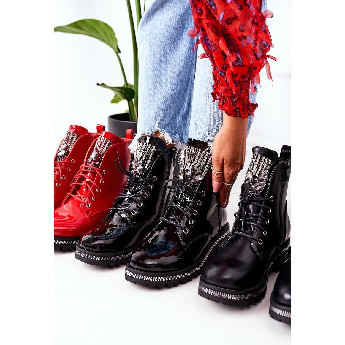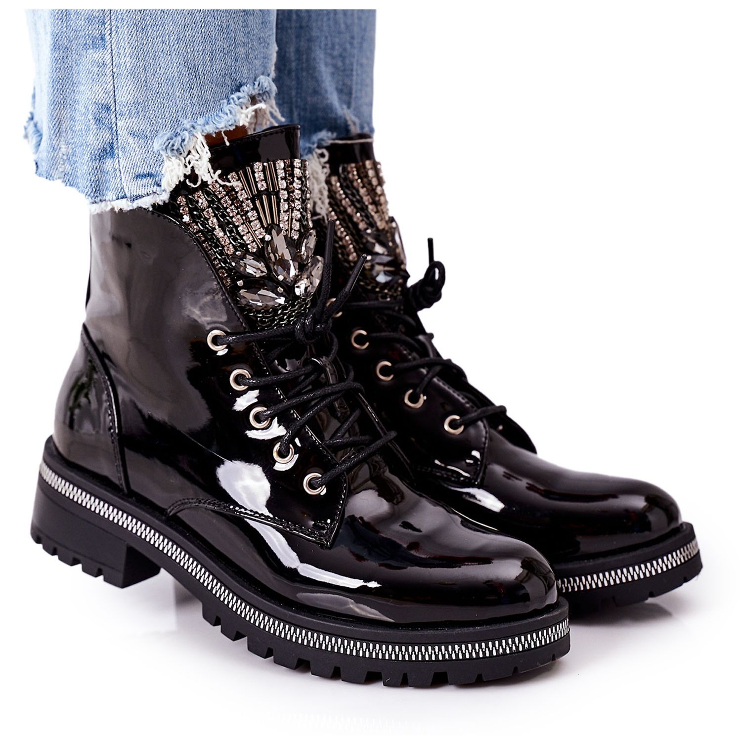 Entdecken Sie einzigartigen Stil und Komfort bei Damenstiefeletten – isolierte Arbeiterstiefel aus Lackleder mit Attention-Strasssteinen in klassischem Schwarz. Diese eleganten und modischen Stiefel sind aus hochwertigem Lackleder gefertigt, was nicht nur für ein attraktives Aussehen, sondern auch für Langlebigkeit sorgt.