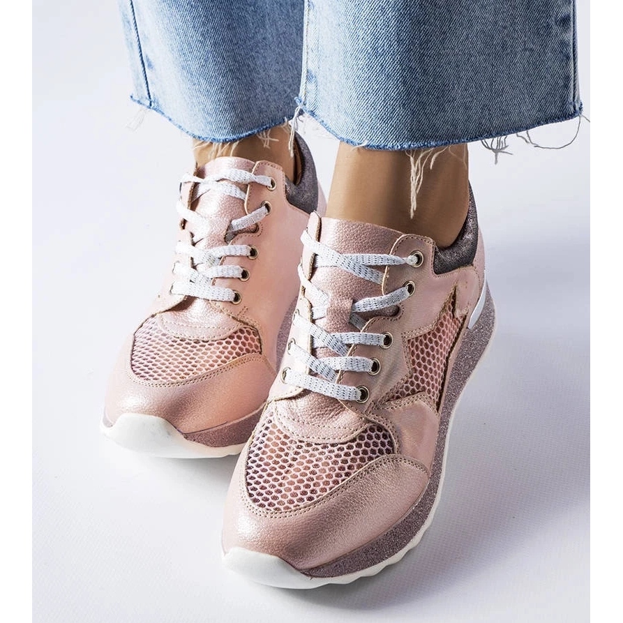 Sneaker zeichnen sich durch eine modische, hohe Sohle aus, die nicht nur einige Zentimeter hinzufügt, sondern auch die dynamische Natur des gesamten Schuhe betont. Ihre äußere Beschichtung besteht aus natürlichen Leder, was die Haltbarkeit und ein elegantes Aussehen gewährleistet, während Designereinsätze von Öko-menschlicher Strömung in einer schönen rosa Farbe einen einzigartigen Charme verleihen.