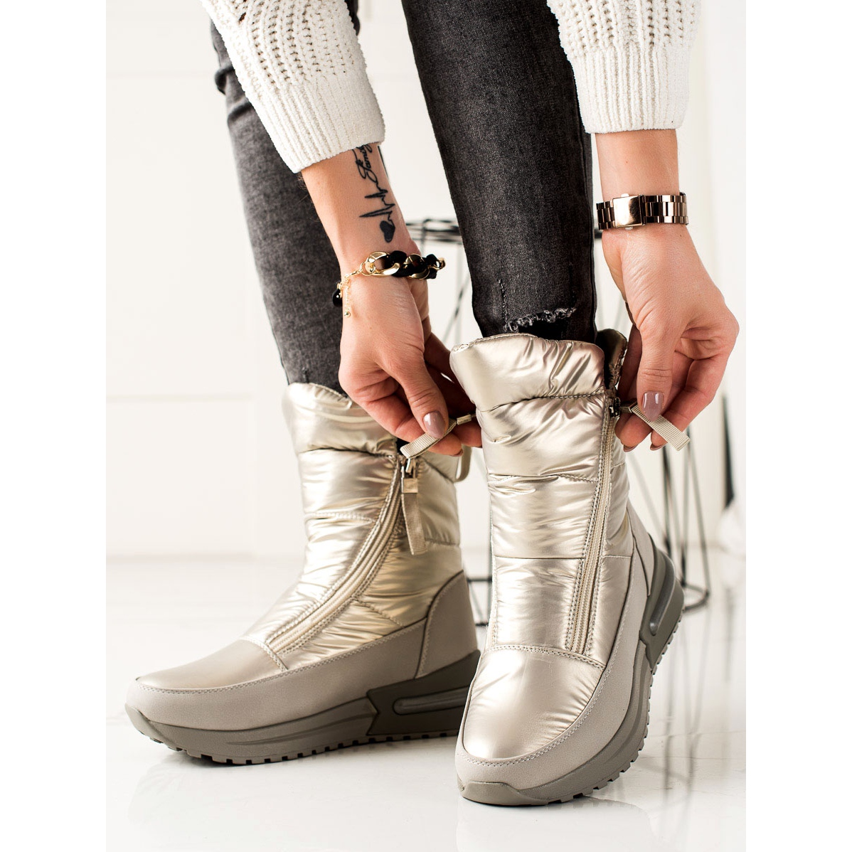 Die Wintersaison steht vor der Tür und die Schneestiefel „Casual Silver“ von Weide sind die perfekte Wahl für Frauen, die sowohl Wert auf Stil als auch auf Komfort legen. Diese eleganten silbernen Schuhe passen perfekt zum lässigen Stil und ihr hoher Schaft, 15–16 cm hoch und 18–20 cm breit, sorgt für eine perfekte Passform und Schutz vor Kälte.