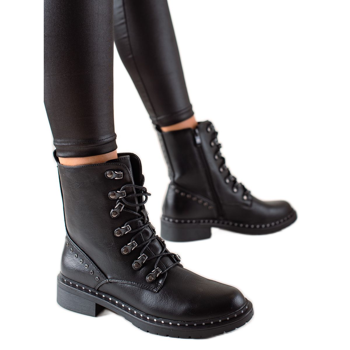 Im Inneren der Stiefel befindet sich eine Isolierung und ein Textileinsatz, der Ihre Füße auch an kälteren Tagen warm hält. Die Strasssteine auf dem Obermaterial verleihen ihnen einen einzigartigen und modischen Look, der sicherlich alle Blicke auf sich ziehen wird. Der Reißverschluss und der Schnürverschluss ermöglichen ein einfaches und schnelles Anziehen der Schuhe.