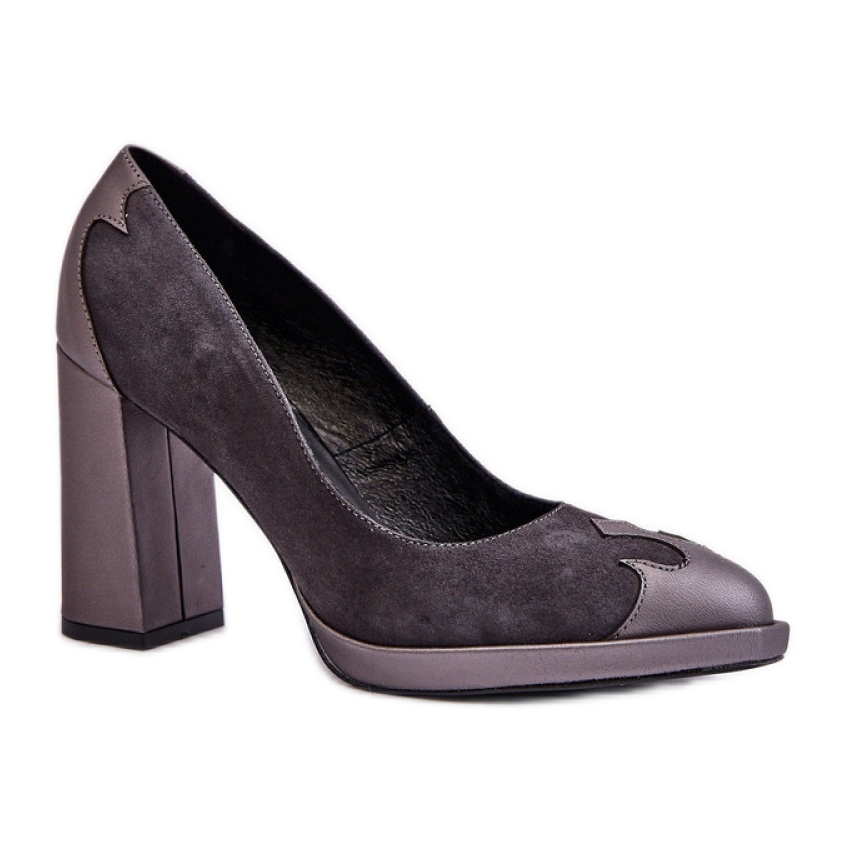 Wir präsentieren Pumpen auf dem Laura Messi Post in einer eleganten grauen Farbe, die die perfekte Kombination aus Klassiker, Komfort und modernem Design darstellen. Diese geschmackvollen Schuhe aus natürlichen Wildlederleder mit Aufmerksamkeit für jedes Detail werden eine perfekte Ergänzung für jede Garderobe sein.