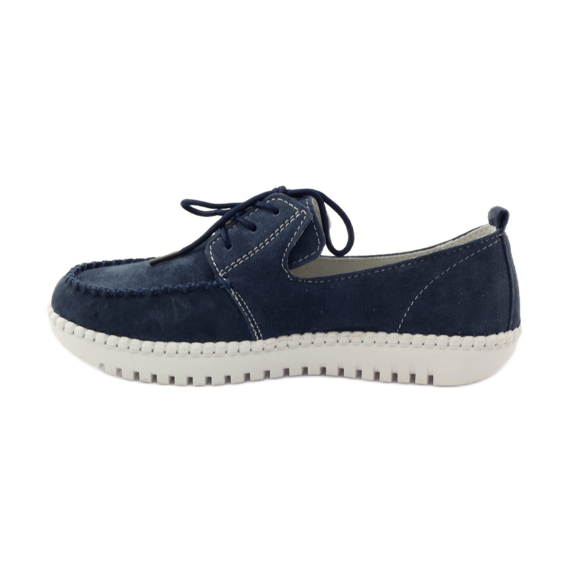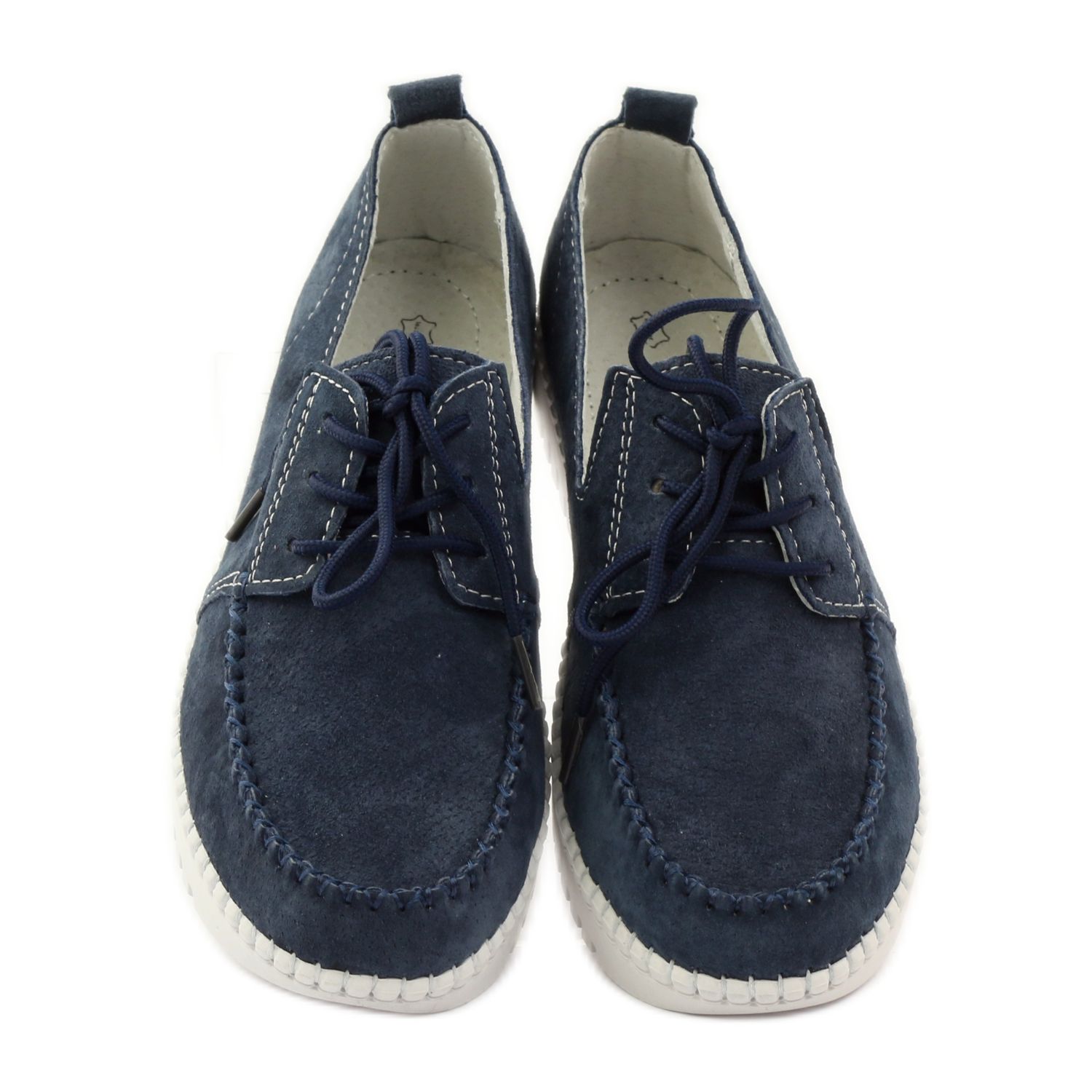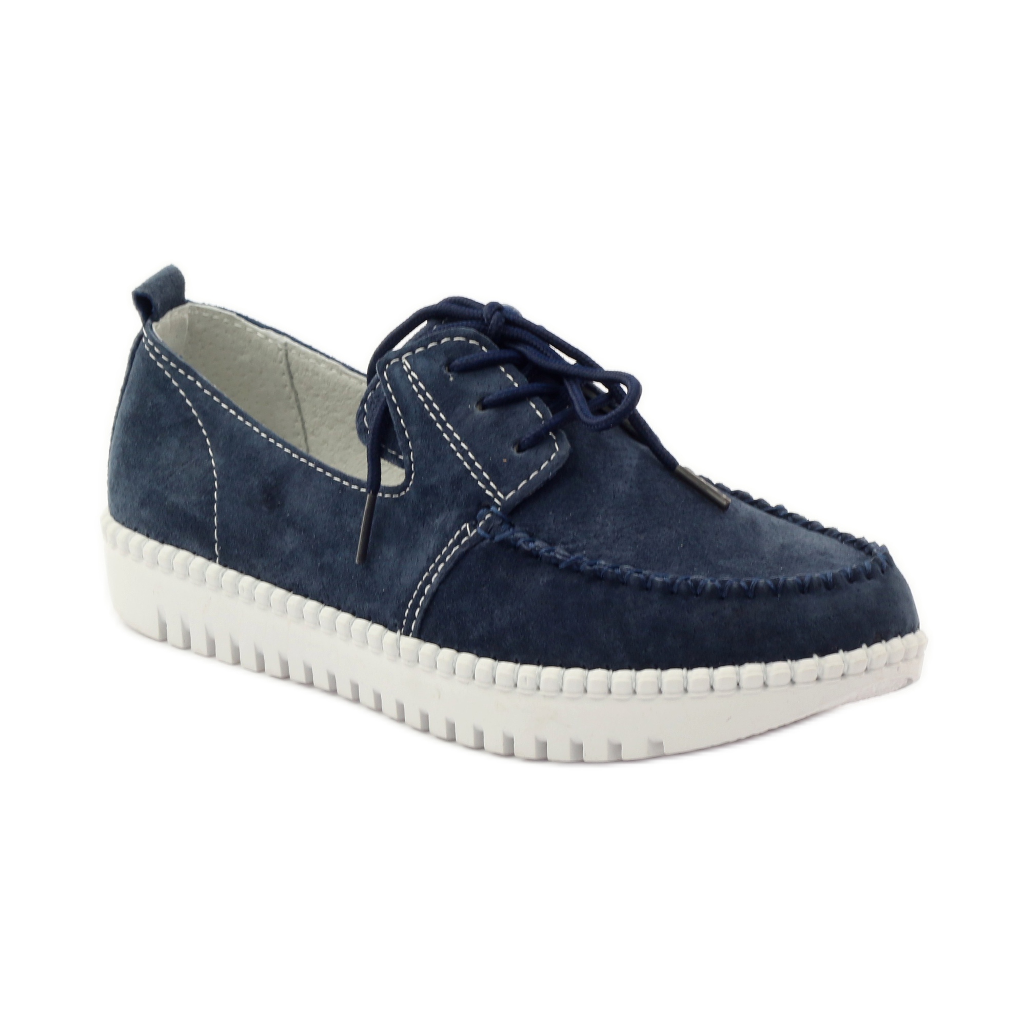 Das Obermaterial und die Innenausstattung dieser Schuhe bestehen aus Naturleder, was nicht nur für Langlebigkeit, sondern auch für eine hervorragende Belüftung sorgt, was besonders an wärmeren Tagen wichtig ist. Die marineblaue Farbe der Schuhe, ergänzt durch weiße Nähte, verleiht ihnen einen modernen und stilvollen Look.