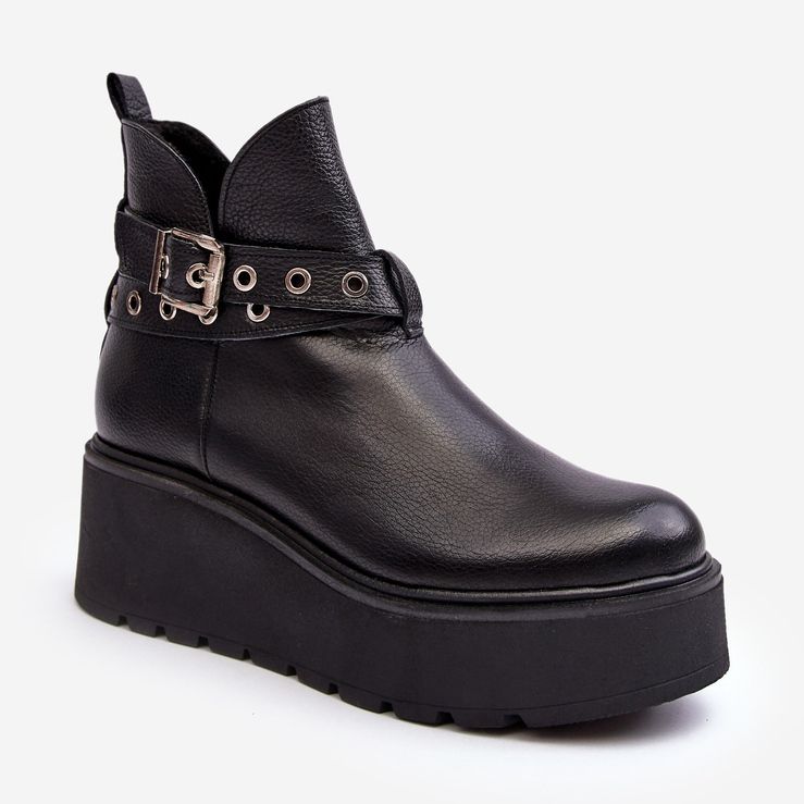 Elegante und praktische Keilstiefel aus hochwertigem natürlichen Leder. Setzen Sie auf einem stabilen 7 -cm -Keil mit einer massiven Plattform, ideal für kühlere Tage - isoliert mit einer Schuhdecke und mit einem weichen Einsatz ausgestattet, den Sie den ganzen Tag über Komfort bieten. Der Obere erreicht den Knöchel und dekorative Streifen mit einer Schnalle hinzufügen Charakter. Der Reißverschluss erleichtert das Anziehen.