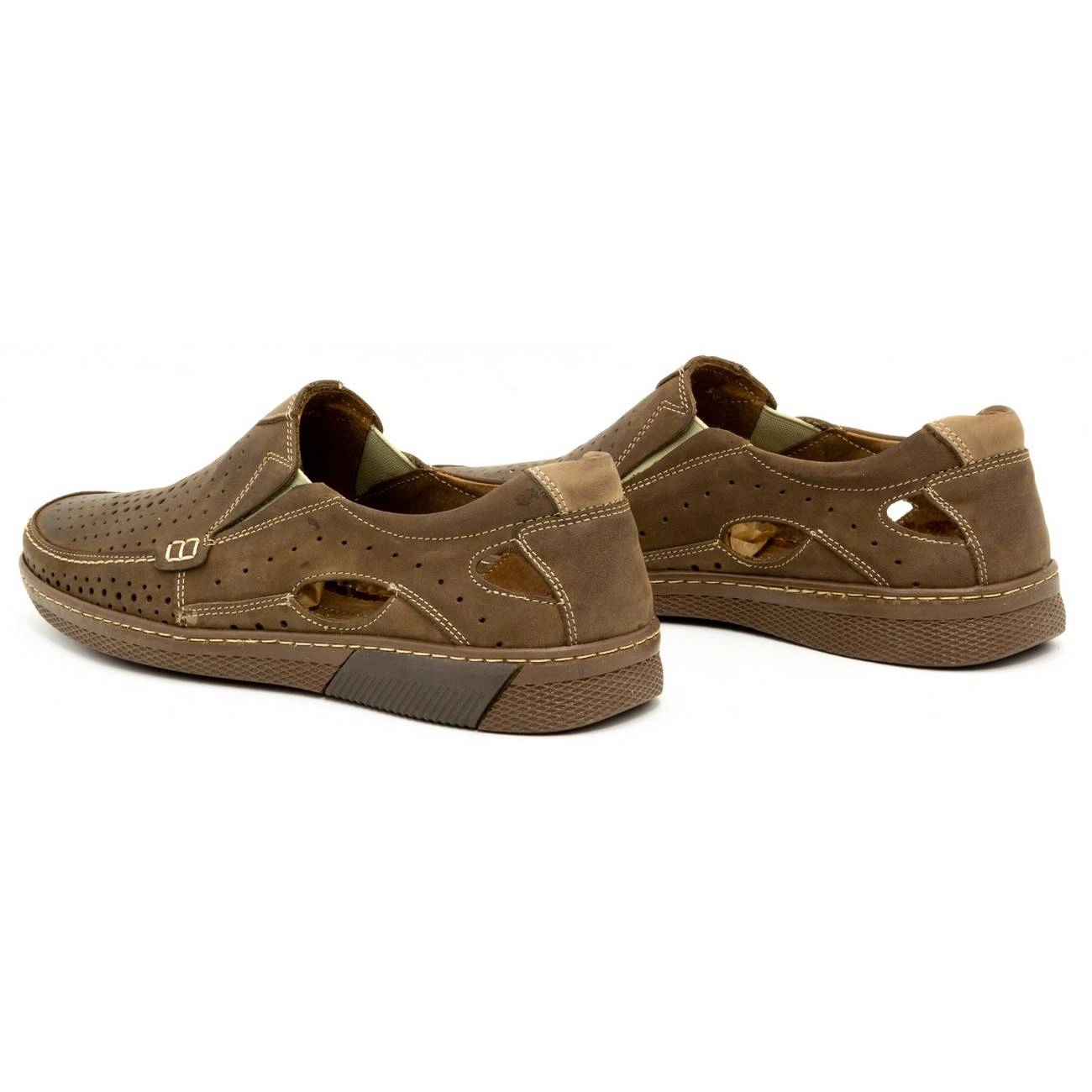 Die eleganten und komfortablen Olivier 937MP -Slipper sind ein Vorschlag für Männer, die in wärmeren Monaten einen leichten, modischen Stil schätzen. Sie wurden ausschließlich aus natürlichen Leder (äußere und Einsätze) hergestellt und bieten eine hervorragende Luftzirkulation, dank der die Füße auch bei hohen Temperaturen frisch bleiben. Das Gleitmodell mit einem delikaten elastischen Band erleichtert das Anziehen und passt sich perfekt an den Fuß an. Eine runde Zehen und einheitliche, braune Farben lassen die Schuhe sowohl mit lässigen Stylisationen als auch in Smart-Casual (z. B. Leinenhosen, Chinos) gut vermischen.