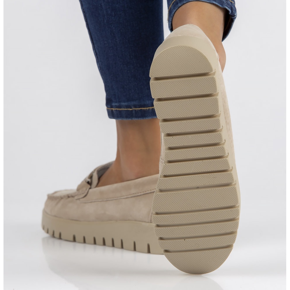Dank des flachen Absatzes und der Plateauhöhe von 2 cm sind diese Mokassins eine ideale Lösung für alltägliche Ausflüge. Die runde Nase und der Steckverschluss ermöglichen ein schnelles und bequemes Anlegen. Darüber hinaus passt ihre universelle beige Farbe perfekt zu verschiedenen Stilrichtungen, sowohl lässig als auch eleganter.
