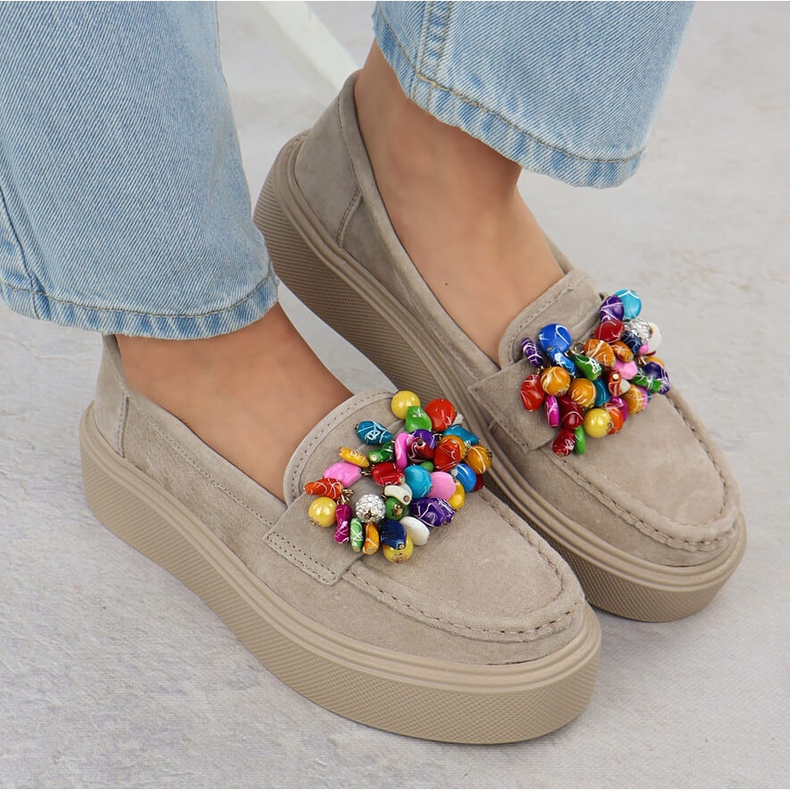 Sie zeichnen sich durch ein einzigartiges Design aus, das mit subtilen Perlen angereichert ist und ihnen ein bisschen Leuchten und Charme verleiht. Perfekt für verschiedene Stilisierungen - von lässiger bis hin zu eleganter. Eine weiche Leder -Innensohle bietet den ganzen Tag Komfort, was sie täglich zur perfekten Wahl macht.