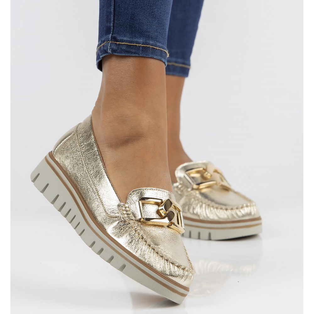 Dank der runden Zehenform passen sich die Mokassins perfekt dem Fuß an und ermöglichen durch die Weite G freie Bewegung. Die goldene Farbe verleiht Eleganz und sorgt dafür, dass sie problemlos in viele Stile passen, sowohl legere als auch formellere.