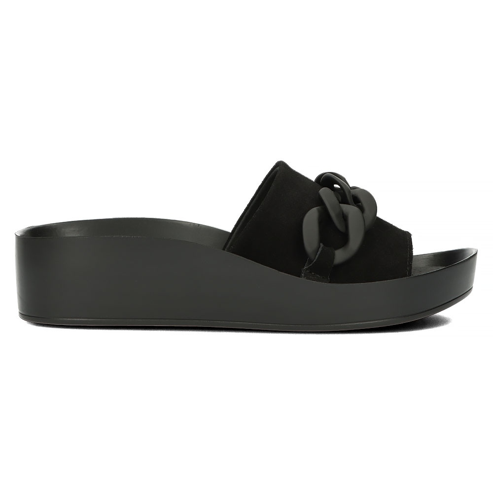 Die zehenstegsandalen haben eine 4,5 cm hohe Synthetiksohle, die Stöße perfekt absorbiert, und die runde Zehenform sorgt für Komfort und Bewegungsfreiheit. Sie zeichnen sich außerdem durch eine dekorative Kette aus, die ihnen einen eleganten Charakter verleiht.