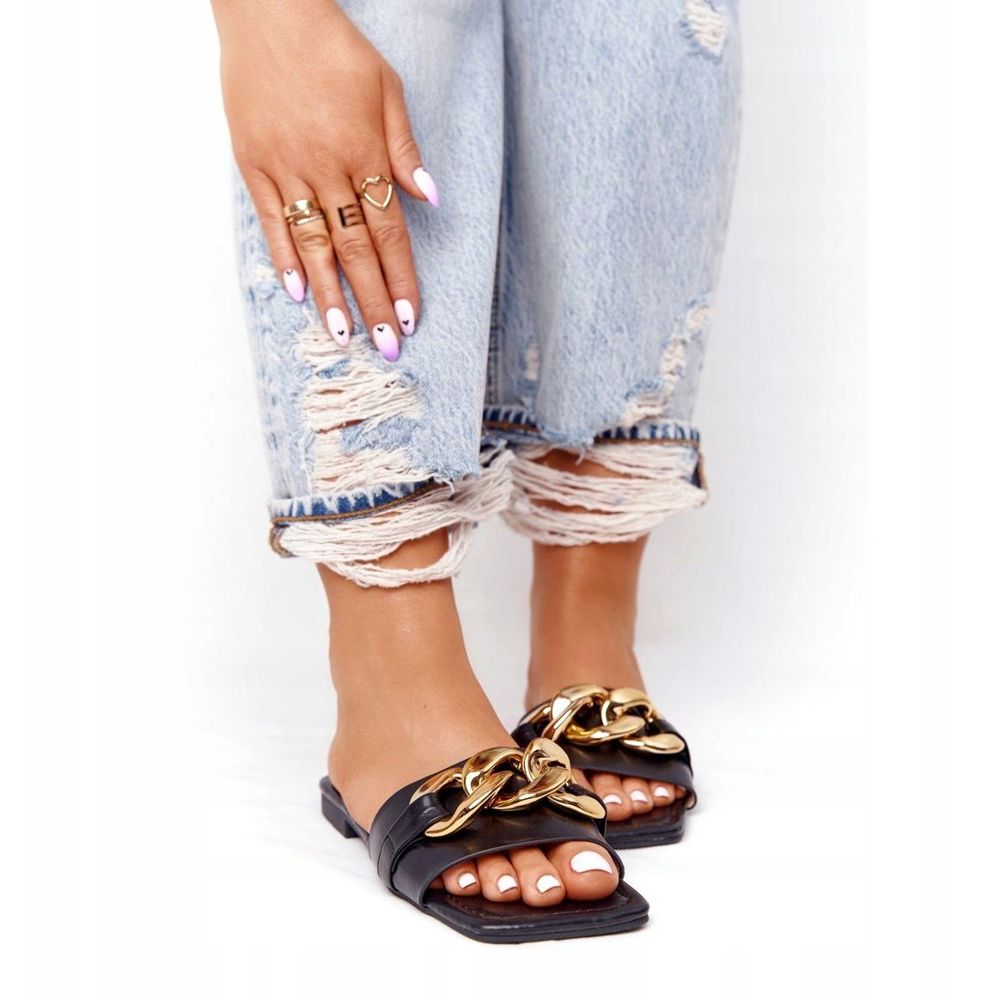 Leder-zehenstegsandalen mit Kette Black French Kiss sind ein ideales Angebot für Frauen, die sowohl Wert auf modisches Design als auch auf Komfort legen. Diese mit einer eleganten Goldkette verzierten Pantoletten zeichnen sich durch eine eckige Zehenpartie aus, was einer der heißesten Trends dieser Saison ist.