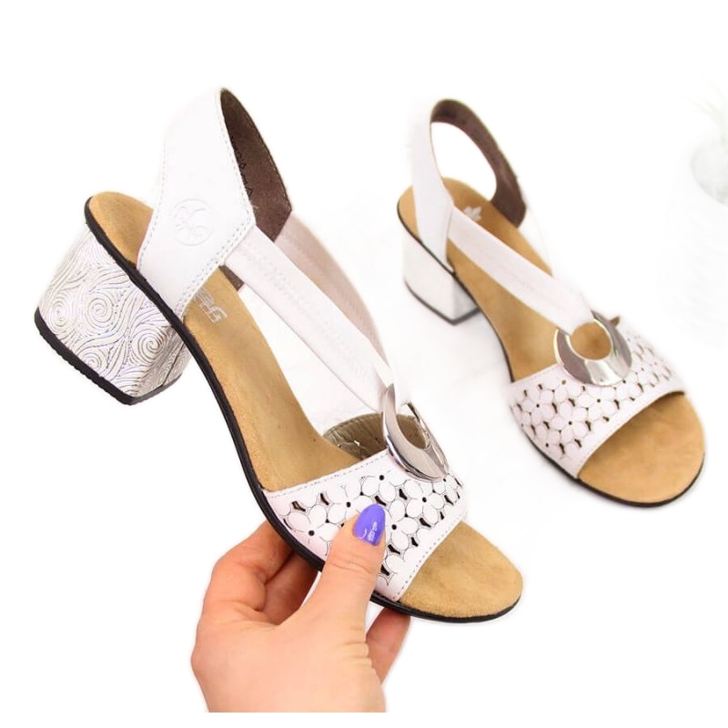 Klassische, elegante Frauensandalen von Rieker, Model in RKR433 in einer universellen weißen Farbe. Die Kombination aus natürlichen Leder mit Gummibändern sorgt dafür, dass das Füßen des Fußes leicht angelegt und perfekt passt, und das leichte Design garantiert den ganzen Tag über Komfort.