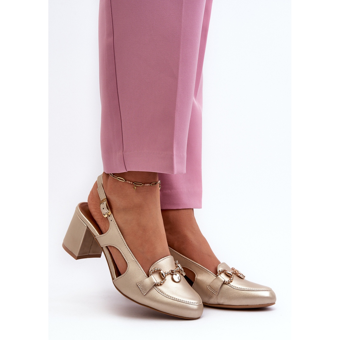 Maciejka -Sandalen zeichnen sich nicht nur durch klassischen Stil, sondern auch mit einem modischen metallischen Goldton aus, der sicherlich das Auge fällt und den Glanz jeglicher Stylisierung verleiht. Dank ihrer Universalität mischen sie sich perfekt mit eleganten Kleidern und lässigen Sets.
